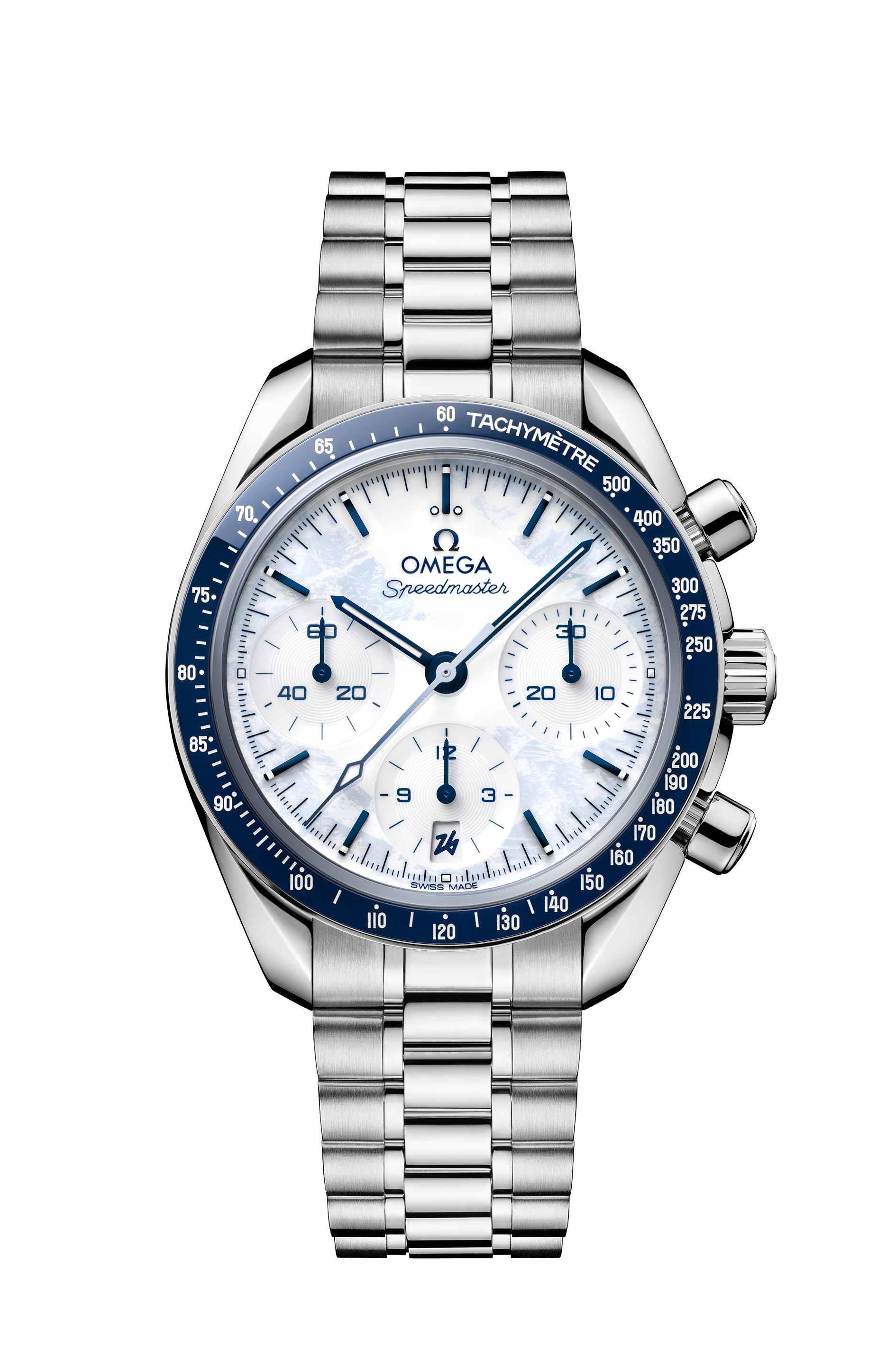 The Speedmaster Milano Cortina 2026 features a 38 mm case in fully polished stainless steel. This is fitted with a blue ceramic bezel featuring a white enamel tachymeter scale. The white lacquered dial, coated with a light blue frost effect, adds a wintry touch. A finger line runs through the frost, forming a pattern inspired by the „2“ of the Milano Cortina 2026 logo. The subdials are also lacquered and finished with a special azurage technique reminiscent of freshly groomed ski slopes.