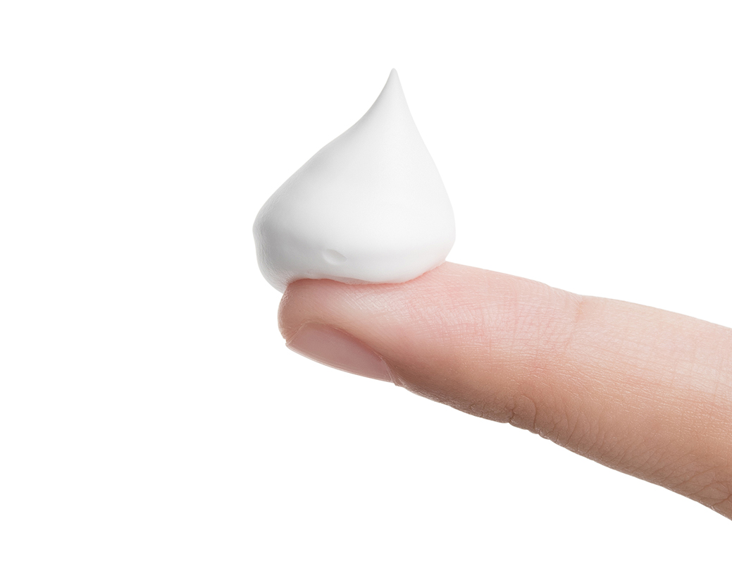 Foam on finger female isolated on white background close up