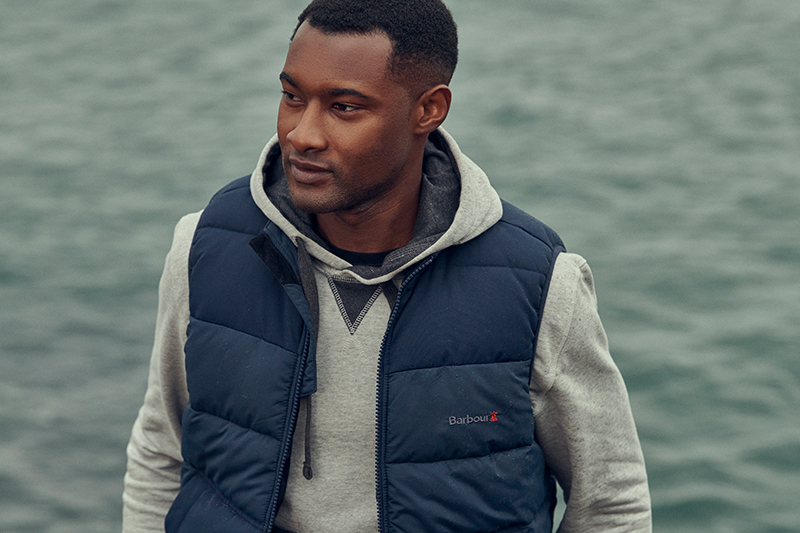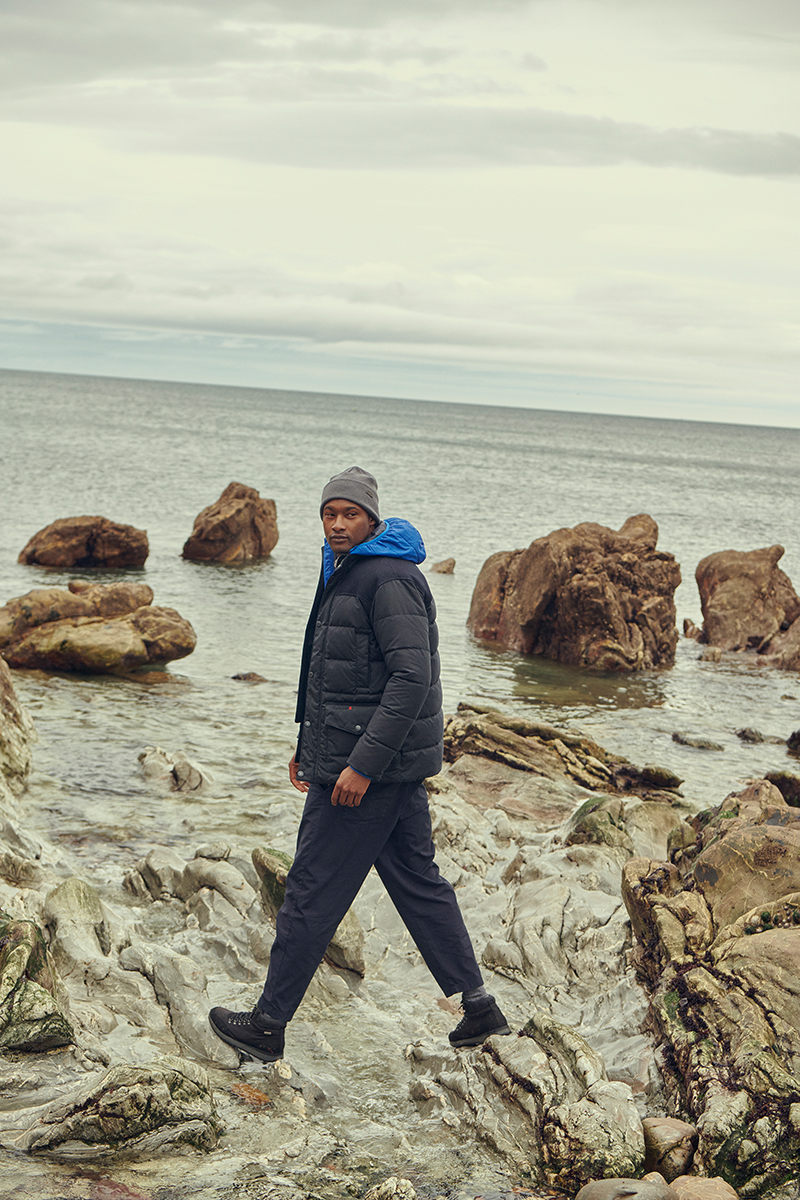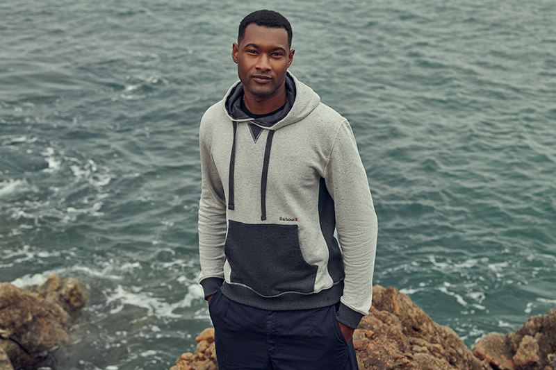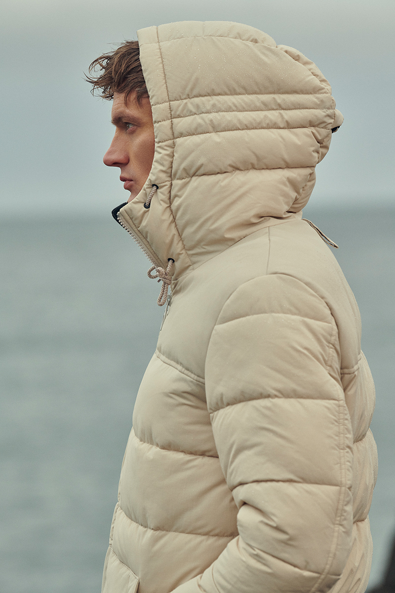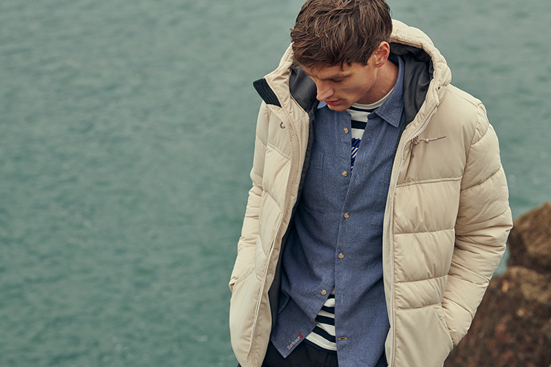 Der Name der Kollektion 55 Degrees North symbolisiert den Längen- und Breitengrad von Barbours Factory in South Shields im Nordosten Englands. Die Ursprünge des Unternehmens gehen auf das Jahr 1894 zurück, als John Barbour sein erstes Geschäft in der damaligen Hafenstadt South Shields eröffnete. Kernige Jacken aus gewachster Baumwolle, gestepptem Nylon und wasserfesten, atmungsaktiven Materialien mit funktionalen Features wie Kapuzen und Tunnelzügen treffen auf warmen Strick aus hochwertiger Wolle, karierte Hemden und weiche Baumwollshirts. Der Fokus liegt auf nachhaltigen Materialien wie dem innovativen SeaWool-Gewebe, das aus recycelten Austernschalen hergestellt wird. Ein kräftiges Blau setzt Akzente innerhalb der maritim inspirierten Farbpalette aus gedeckten Tönen wie Navy, Beige und Grau.