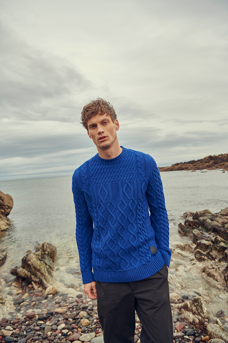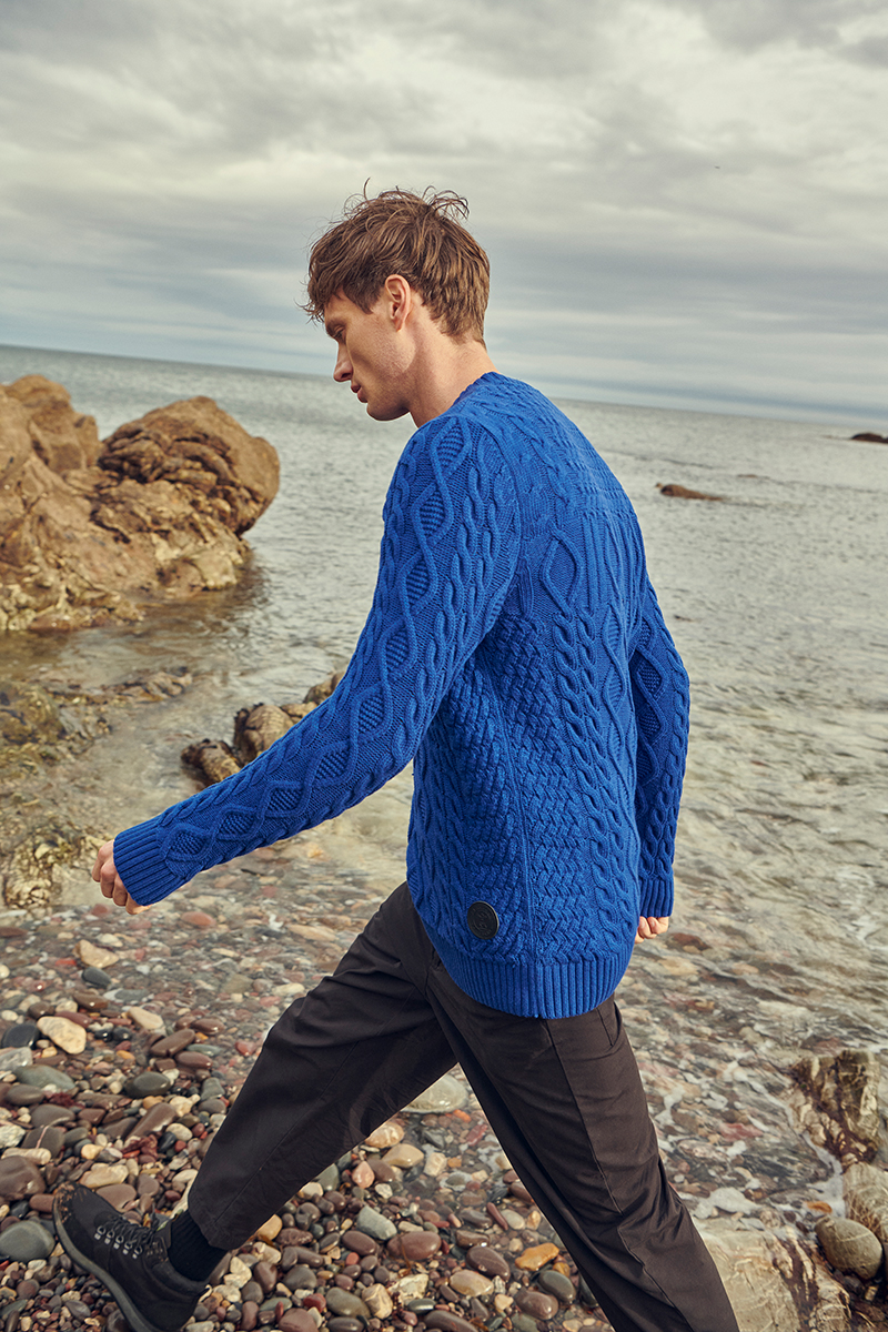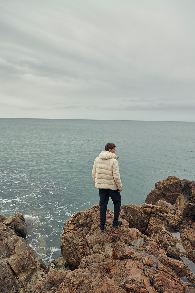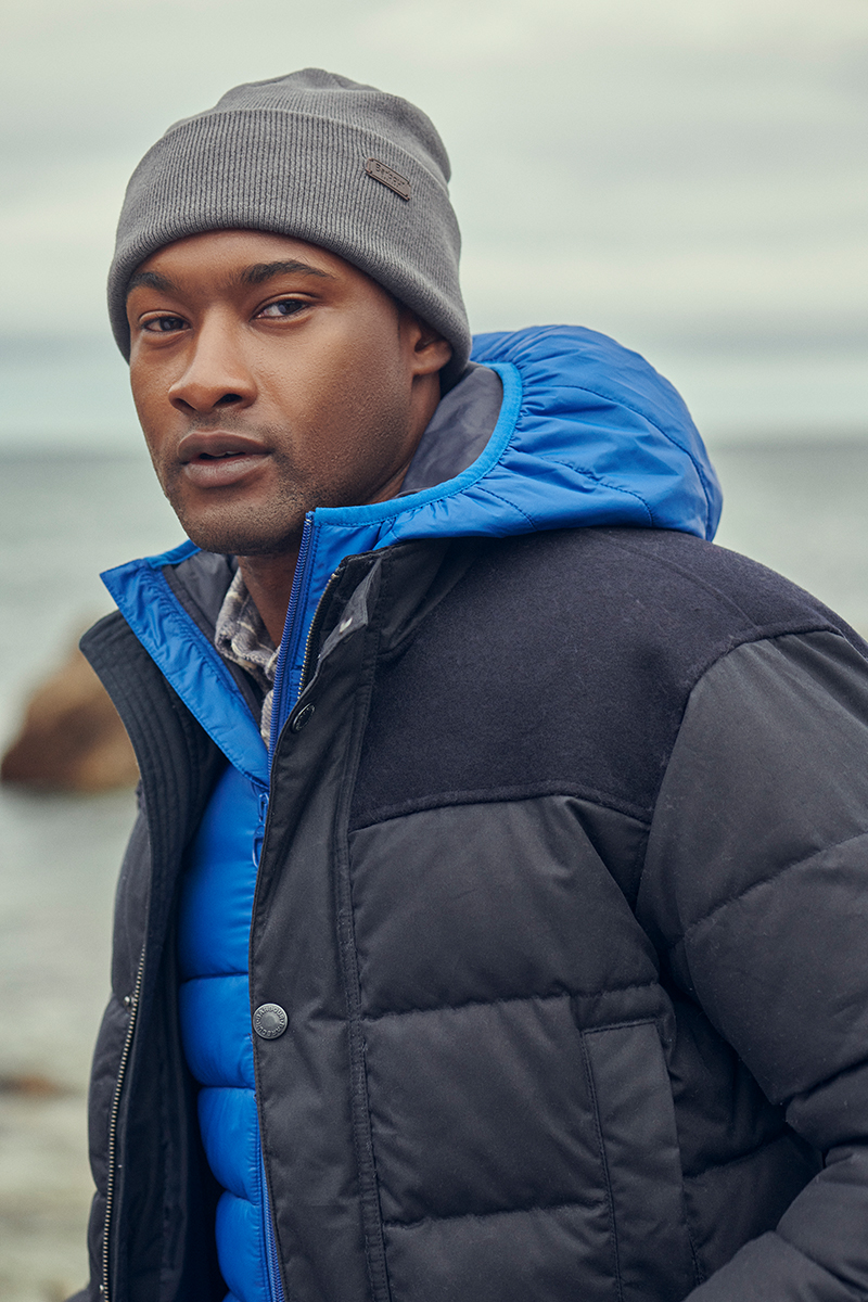Der Name der Kollektion 55 Degrees North symbolisiert den Längen- und Breitengrad von Barbours Factory in South Shields im Nordosten Englands. Die Ursprünge des Unternehmens gehen auf das Jahr 1894 zurück, als John Barbour sein erstes Geschäft in der damaligen Hafenstadt South Shields eröffnete. Kernige Jacken aus gewachster Baumwolle, gestepptem Nylon und wasserfesten, atmungsaktiven Materialien mit funktionalen Features wie Kapuzen und Tunnelzügen treffen auf warmen Strick aus hochwertiger Wolle, karierte Hemden und weiche Baumwollshirts. Der Fokus liegt auf nachhaltigen Materialien wie dem innovativen SeaWool-Gewebe, das aus recycelten Austernschalen hergestellt wird. Ein kräftiges Blau setzt Akzente innerhalb der maritim inspirierten Farbpalette aus gedeckten Tönen wie Navy, Beige und Grau.