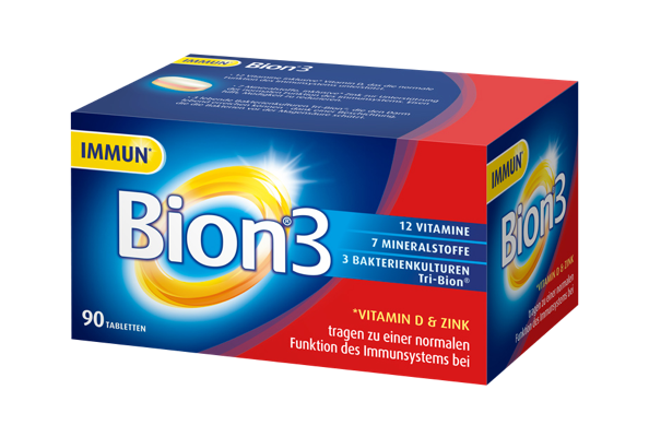 Bion3 Immun* ist in zwei Packungsgrößen mit 30 oder 90 Tabletten in der Apotheke erhältlich. Bion3 Immun* enthält 3 lebende Bakterien der Darmflora: Lactobacillus gasseri, Bifidobacterium bifidum und Bifidobacterium longum. Die Tri-Bion® Technologie schützt die Bakterien mit einer speziellen Tablettenbeschichtung vor der Magensäure und sorgt dafür, dass diese den Darm lebend erreichen können.**