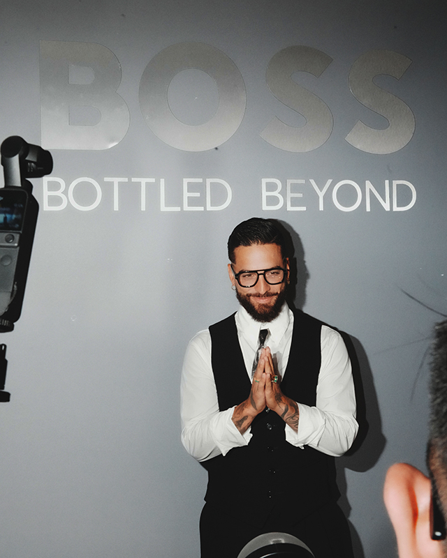 To celebrate the occasion in signature fashion, Maluma wore a bold, tailored creation by Marco Falcioni, Creative Director at HUGO BOSS. The bespoke outfit featured a lightweight black silk overcoat with a silver lining, paired with an oversized double-breasted wool suit and wide-leg trousers and sleek white classic shirt, echoing the deep black-and-gray tones of BOSS Bottled Beyond.