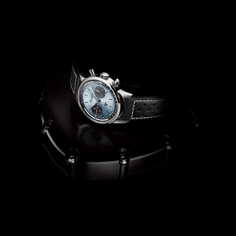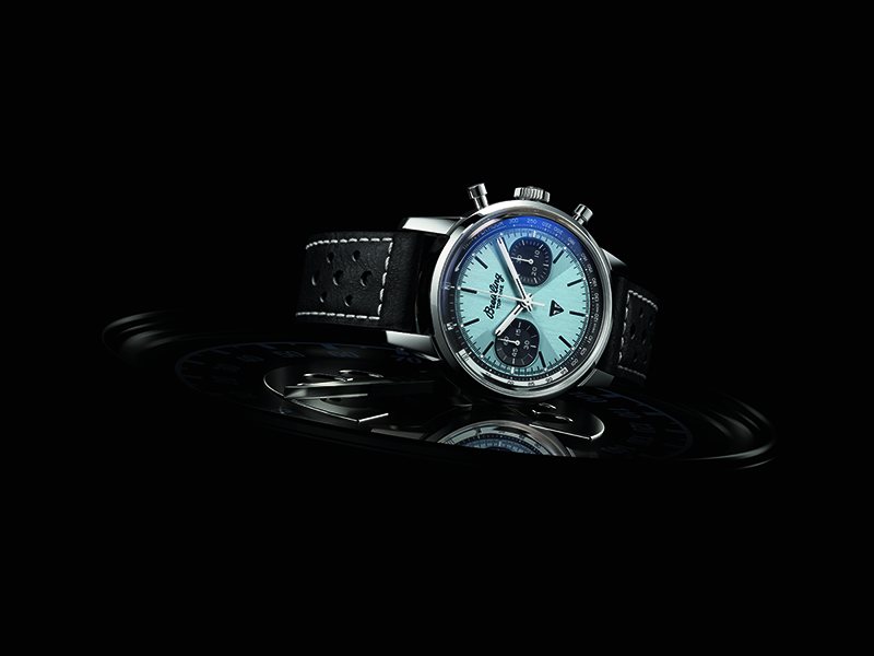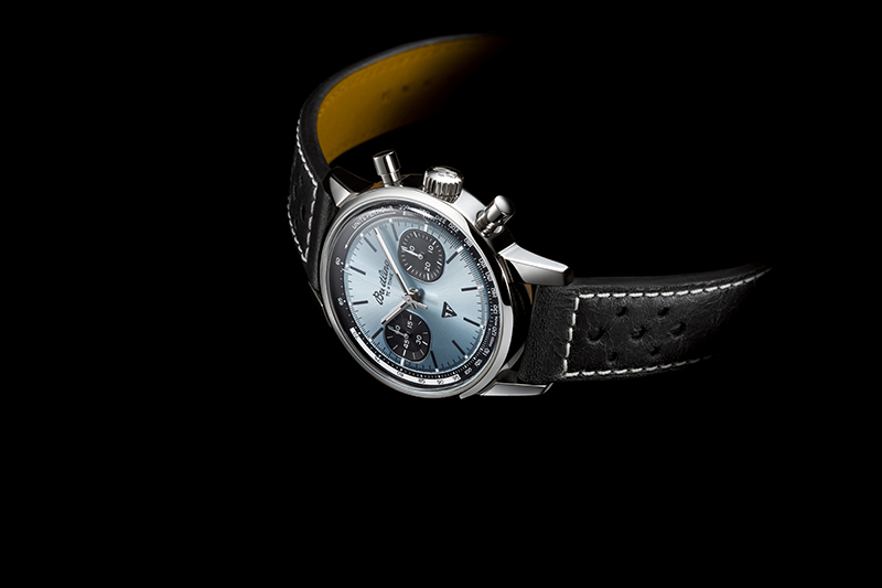 The stars of both watches are their ice-blue dials. This unique color has two major references: a blue Triumph Thunderbird 6T from 1951, and a rare, blue-dialed Breitling Top Time Ref. 815 from the 1970s.