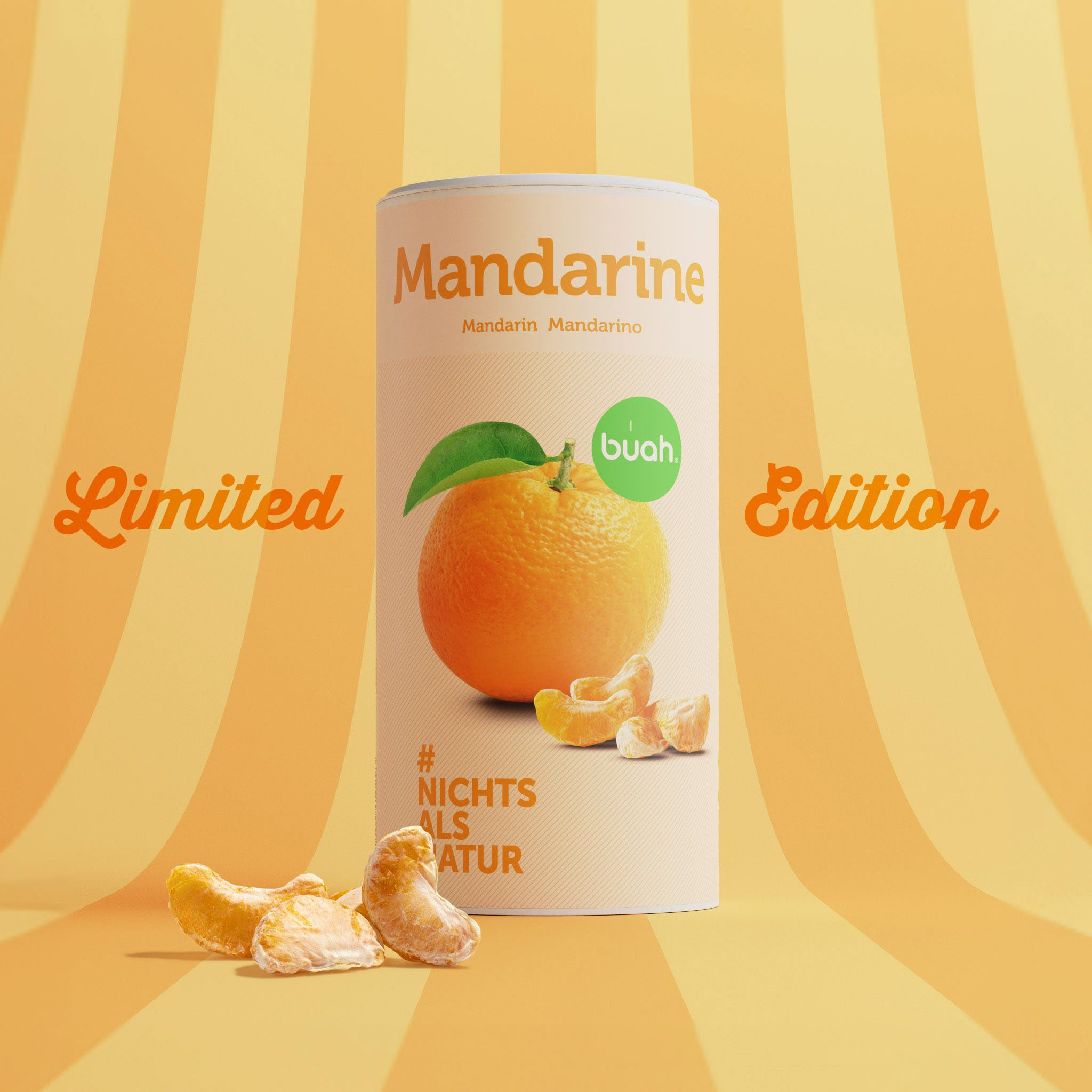 Die neue Sorte Mandarine steht für besonders süßen Fruchtgenuß. Die Die frisch und reif geernteten Früchte bringen frischen Wind in die Produktlinie. Der aromatische Geschmack, der kaum vollmundiger sein könnte und die knusprige Konsistenz machen Lust gleich mehrfach zuzugreifen. Der hohe Vitamingehalt gibt dafür auch ein gutes Argument. Die neue verlockende Variante ist ab Juni als Limited Edition in der großen Dose (Füllgewicht 155g) bei buah im Onlineshop erhältlich. Die gefriergetrockneten Mandarinen von buah können pur oder in kreativen Rezepten genossen werden: Von Joghurts und Müsli bis hin zu Backwaren und Desserts.