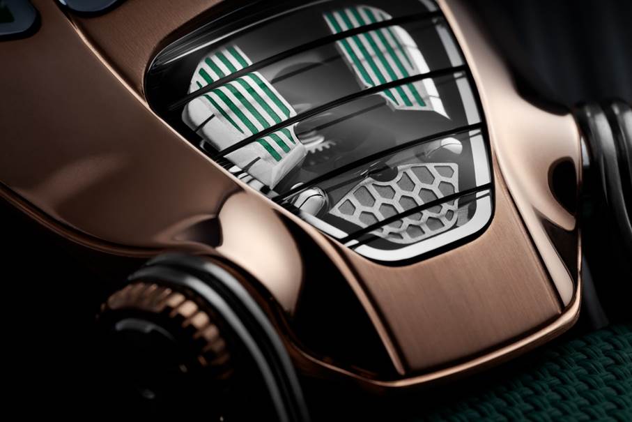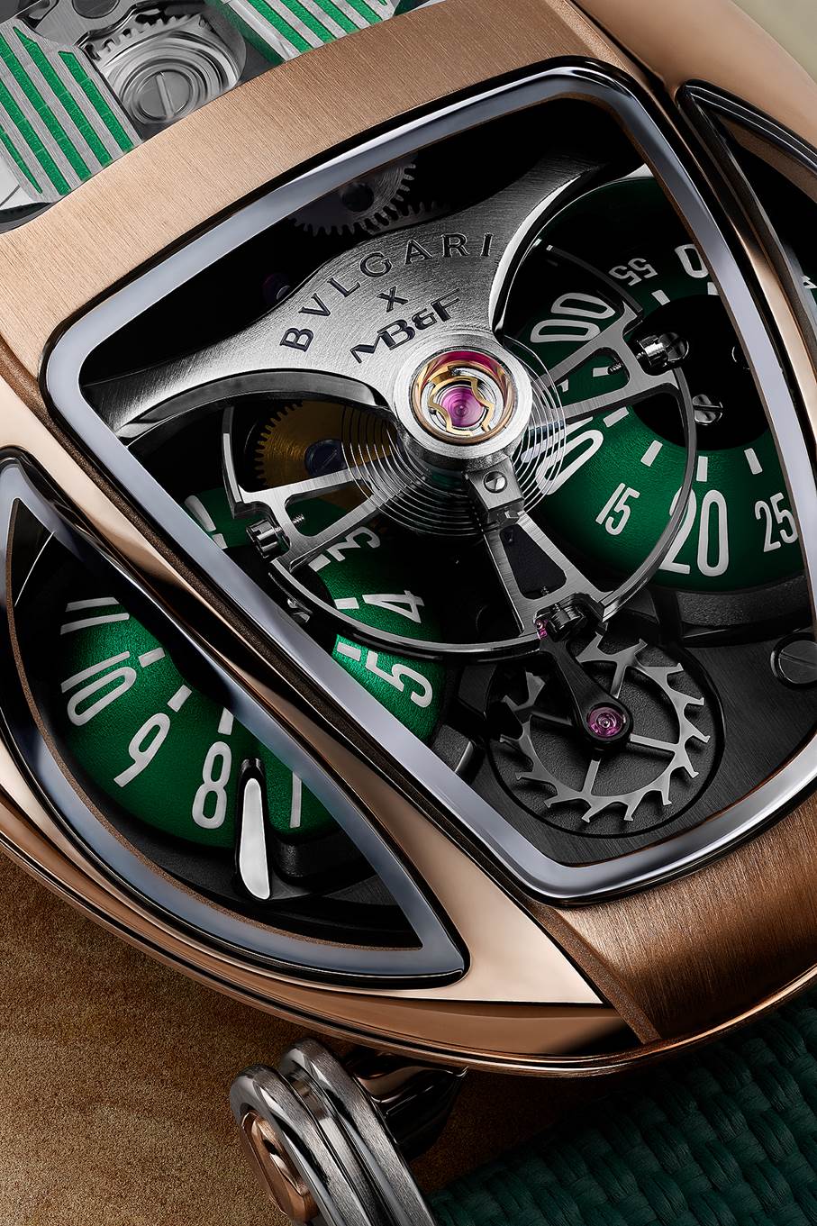 In addition to its obvious Serpenti origins, Fabrizio and Max are car design enthusiasts. They could not resist incorporating automotive codes into the Bvlgari x MB&F Serpenti: the case shaped like sleek automotive bodywork, a complex “stepped” sapphire crystal like the flaps on the rear window of a sports car, crowns that could easily be mistaken for car wheels… The apparent portion of the movement also includes car engine-like components, including a grille with the famous hexagonal scale motif seen on previous Serpenti creations.