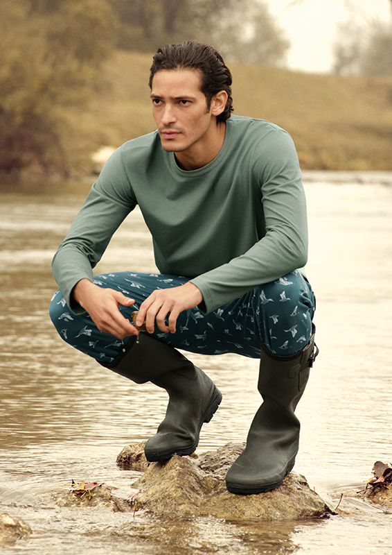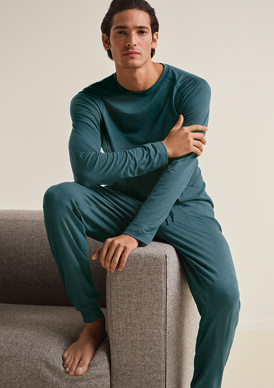 Inspired by the Northern Lights and untouched nature, the third delivery date features a tranquil autumn palette of deep petrol, dark glen green, and cool sapphire blue. Fresh accents like Loden Frost enliven the pattern play: bicolor stripes in Relax Terry, tie-dye and wallpaper patterns in Relax Comfy. The Remix Sleep Weekend mix-and-match series features a simple long-sleeved shirt in Dark Glen with two trouser options—either with a tie-dye pattern or a wild duck print. Crafted from cotton and organic cotton, the series invites you to slow down.