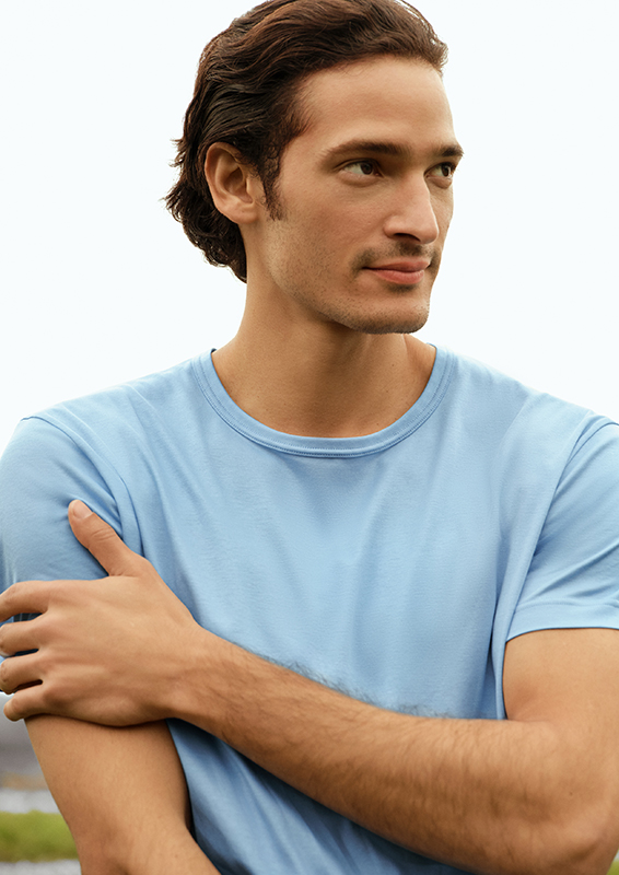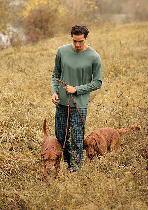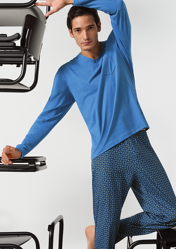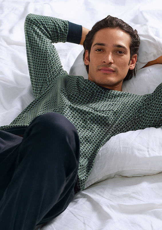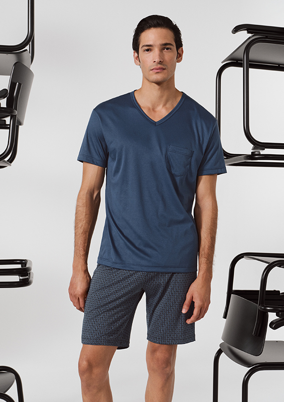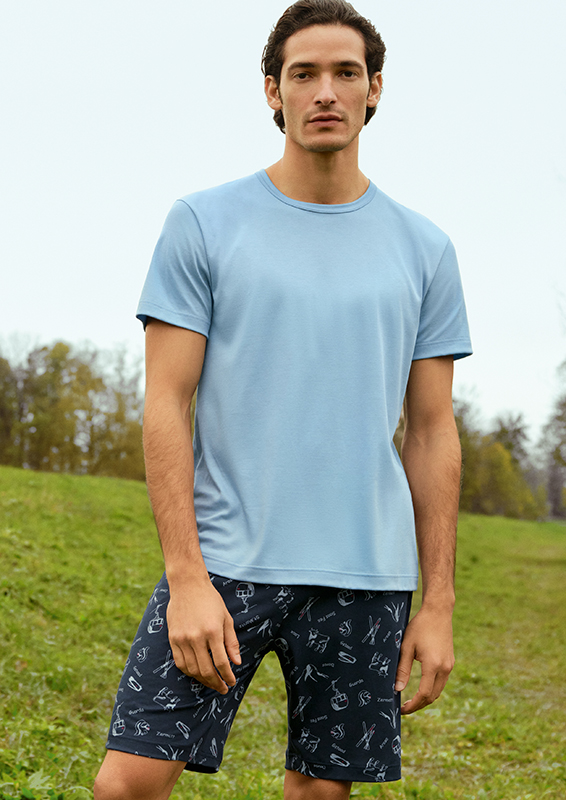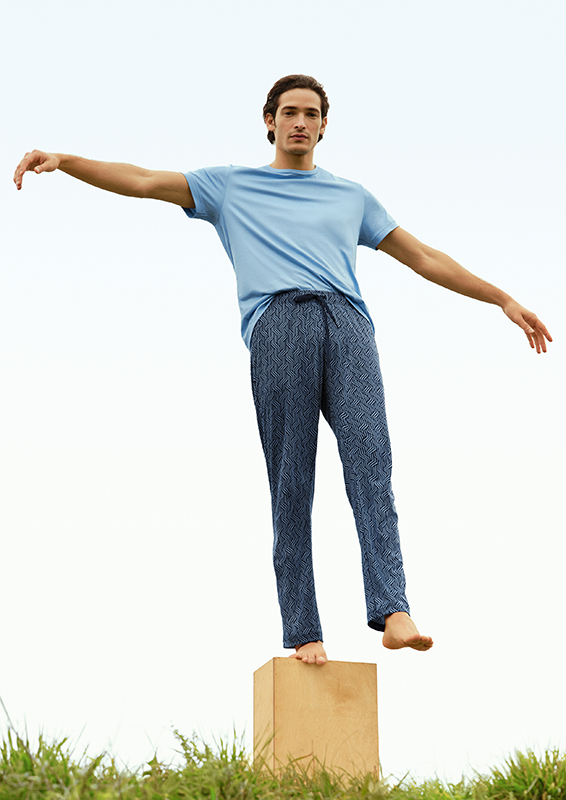 The first delivery date features intense blue tones, complemented by warm nuances like Glazed Ginger. Graphic designs and structured 3D elements characterize daywear lines like Prints and Focus Trend. The mix-and-match Remix Sleep Free series incorporates the color Glacier Lake. Solid-colored shirts with a short button placket meet Bermuda shorts and pants with a modern striped print – complemented by side pockets and drawstrings – for a sporty, casual look. Crafted from a lightweight, soft swiss+cotton/Modal Superlight blend.