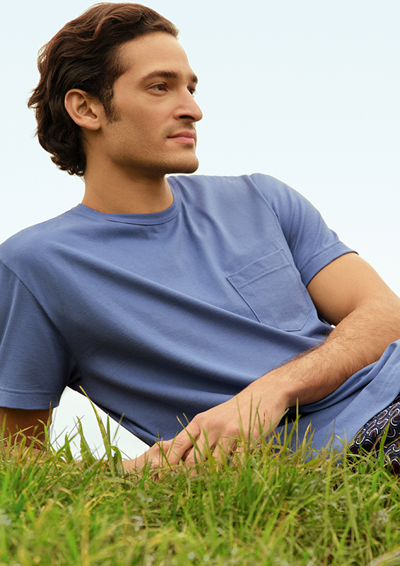Inspired by night-sky-blue lakes and glittering glaciers, a color world unfolds, comprised of graphic prints, striped stripes, and diverse minimal patterns. The Remix Sleep Leisure mix-and-match series combines sophisticated style with exquisite comfort: Solid-colored shirts in Nordic Blue meet relaxed trousers and Bermuda shorts, complemented by simple black styles – ideal for flexible combinations throughout the season. Crafted from soft cotton and organic cotton