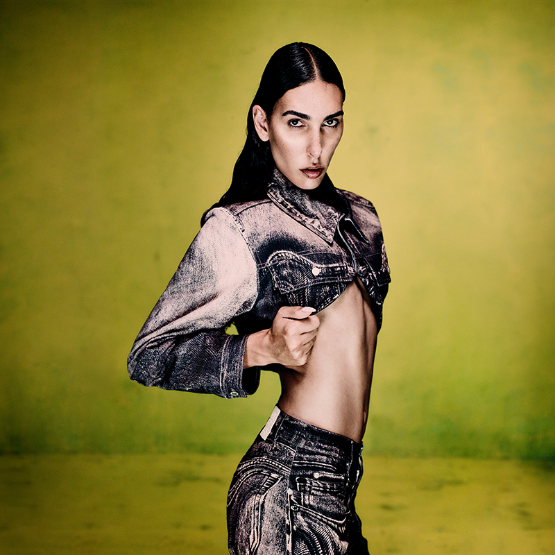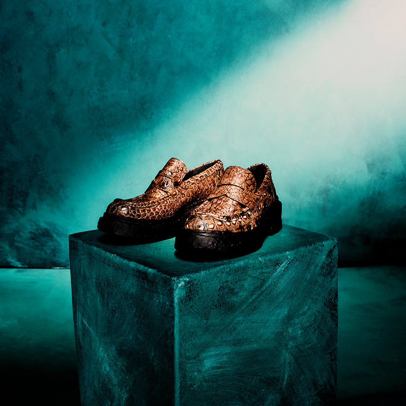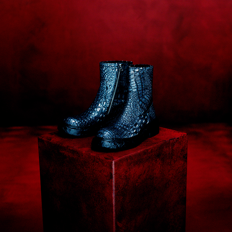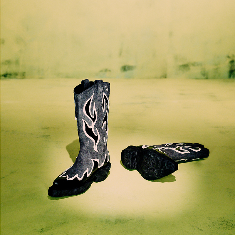 Taking its place in front of hand-painted backgrounds in bold monochrome shades, the campaign focuses on this season’s key styles, from a flaming new version of the brand’s classic Venga cowboy boot in distressed suede and the signature Candiani denim styles with swerving trompe l’oeil patterns, to the embossed croc-effect leather ensembles and intarsia knitwear with more than just a few loose threads.