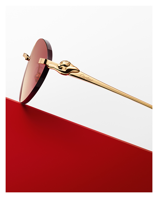 The Panthère de Cartier concept elevates the alluring beauty of the iconic feline inspired by the Maison’s high jewelry pieces. The feline silhouette runs along sinuous metal temples enriched with a bi-dimensional head on the end pieces and tail on the temple tips.