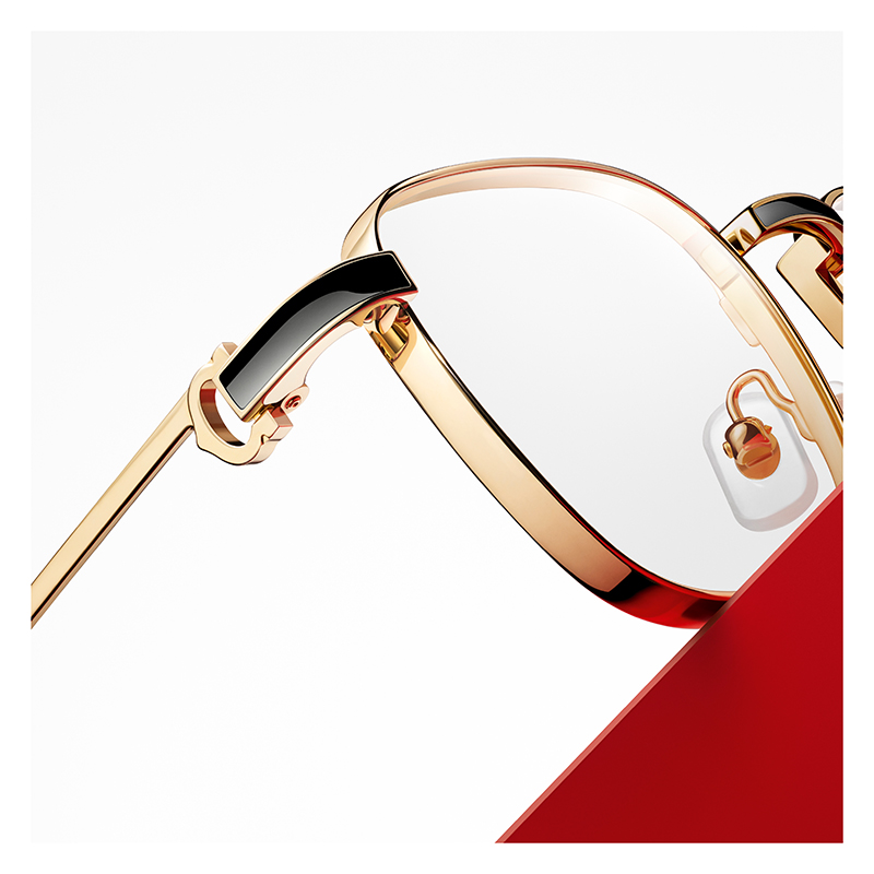 Full-rim optical frame featuring a soft square shape in metal with a golden, or platinum finish enriched with enamel details on the front and the hinges with the godron motif and C de Cartier emblem. The Double C logo appears on the nose pads and the Cartier logo plaque is set on the acetate temple tips.