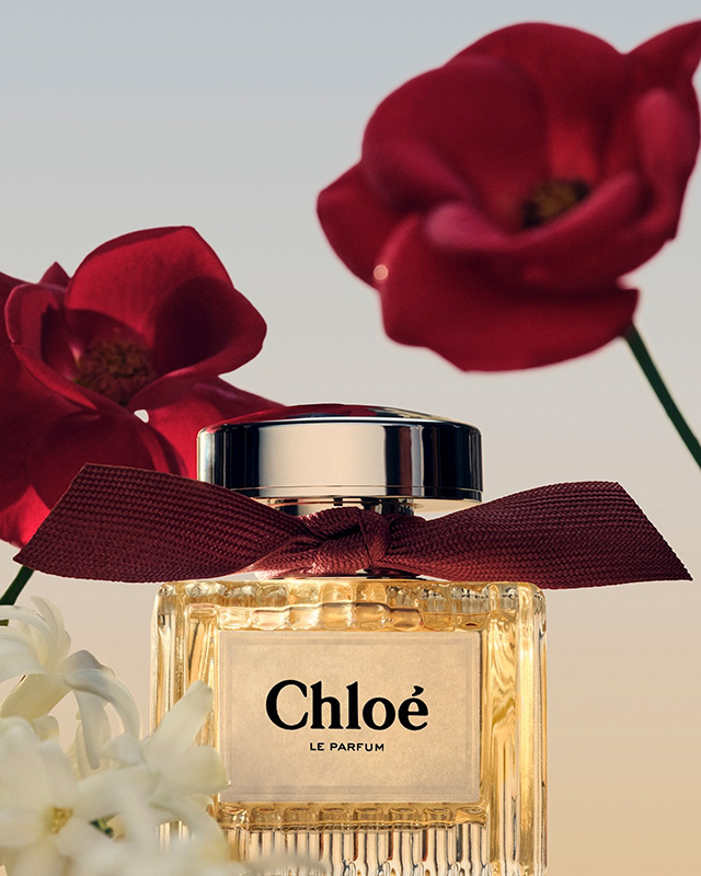 The intensity of Le Parfum is unmistakable: It is revealed both in the dark amber liquid in the signature gold-lacquered glass bottle with a pleated pattern and in the deep burgundy red of the hand-tied ribbon. The hue, which comes from the palette of Chloé’s fashion studio, is reflected in the blooming flower in the campaign motifs.