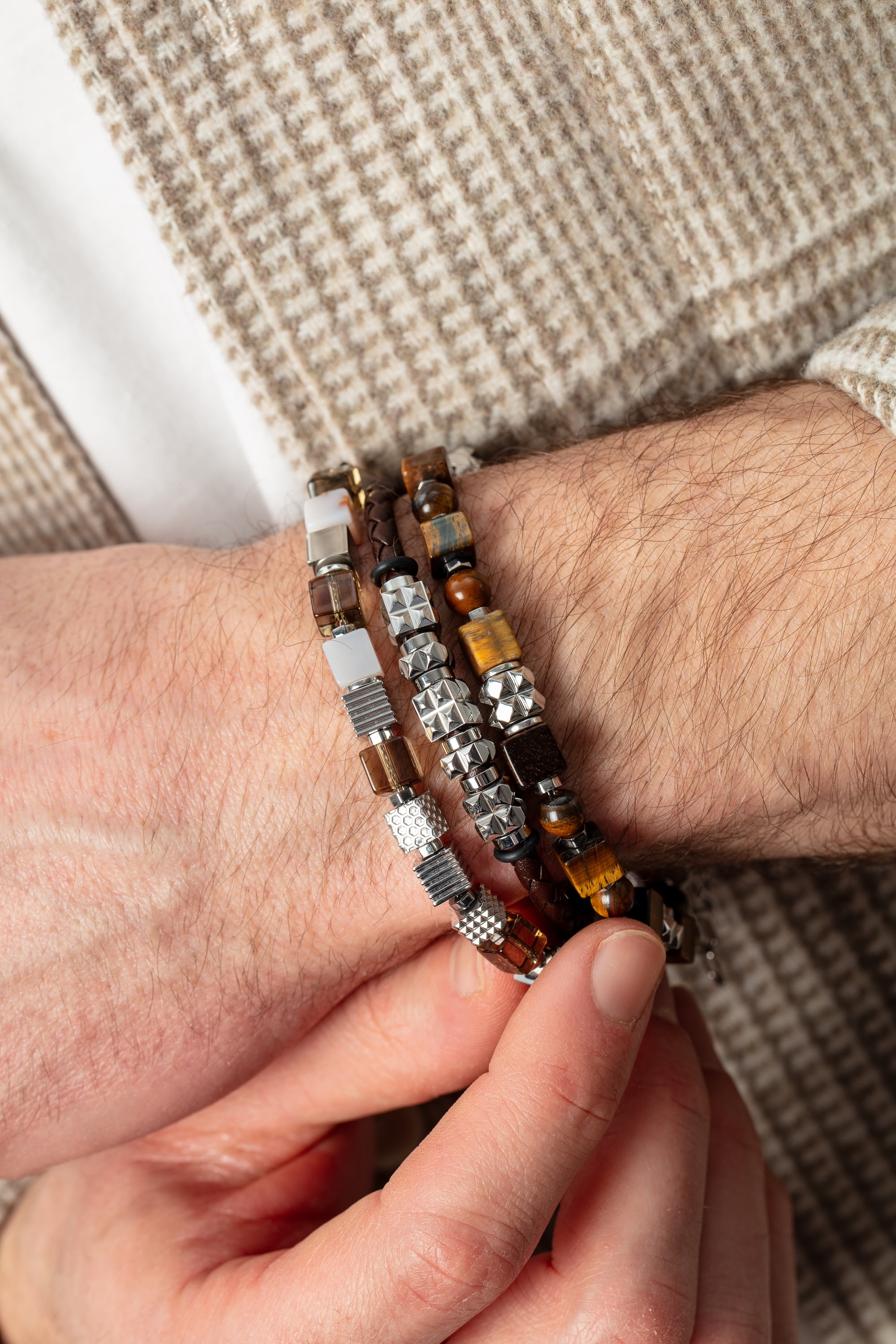 Warm brown and natural tones—for example, in the form of select natural stones and leather details—lend the collection depth, grounding, and confidence.