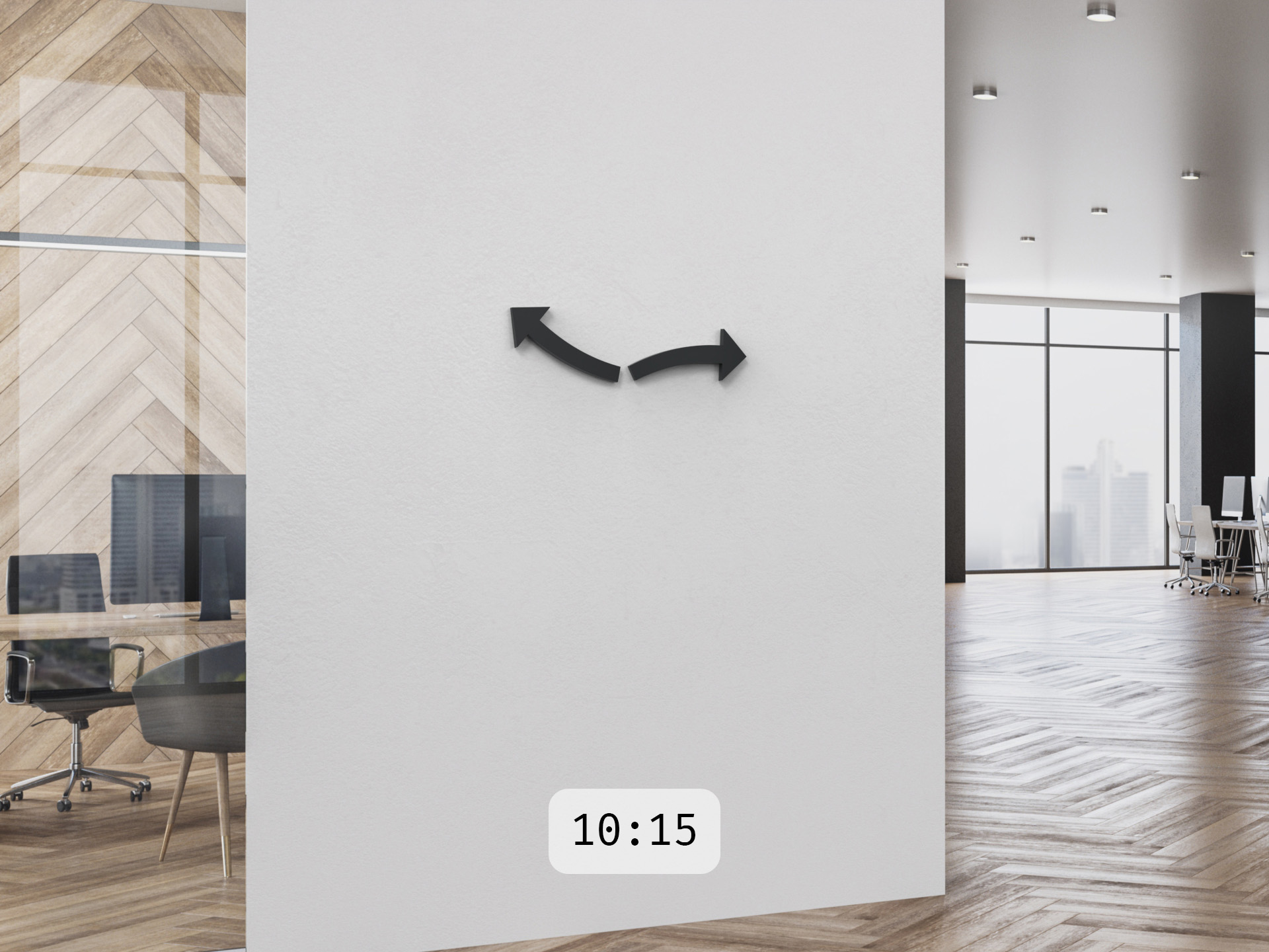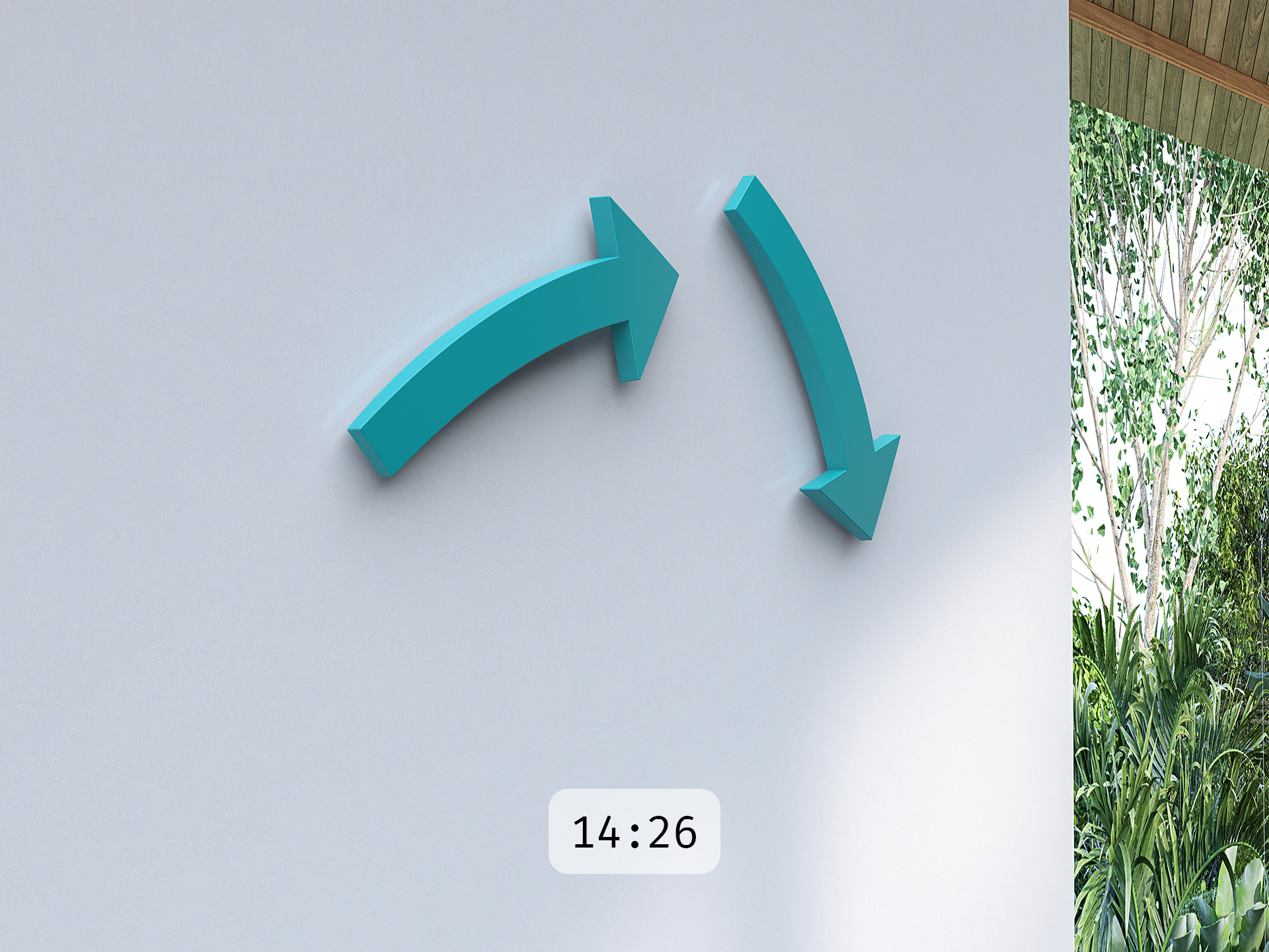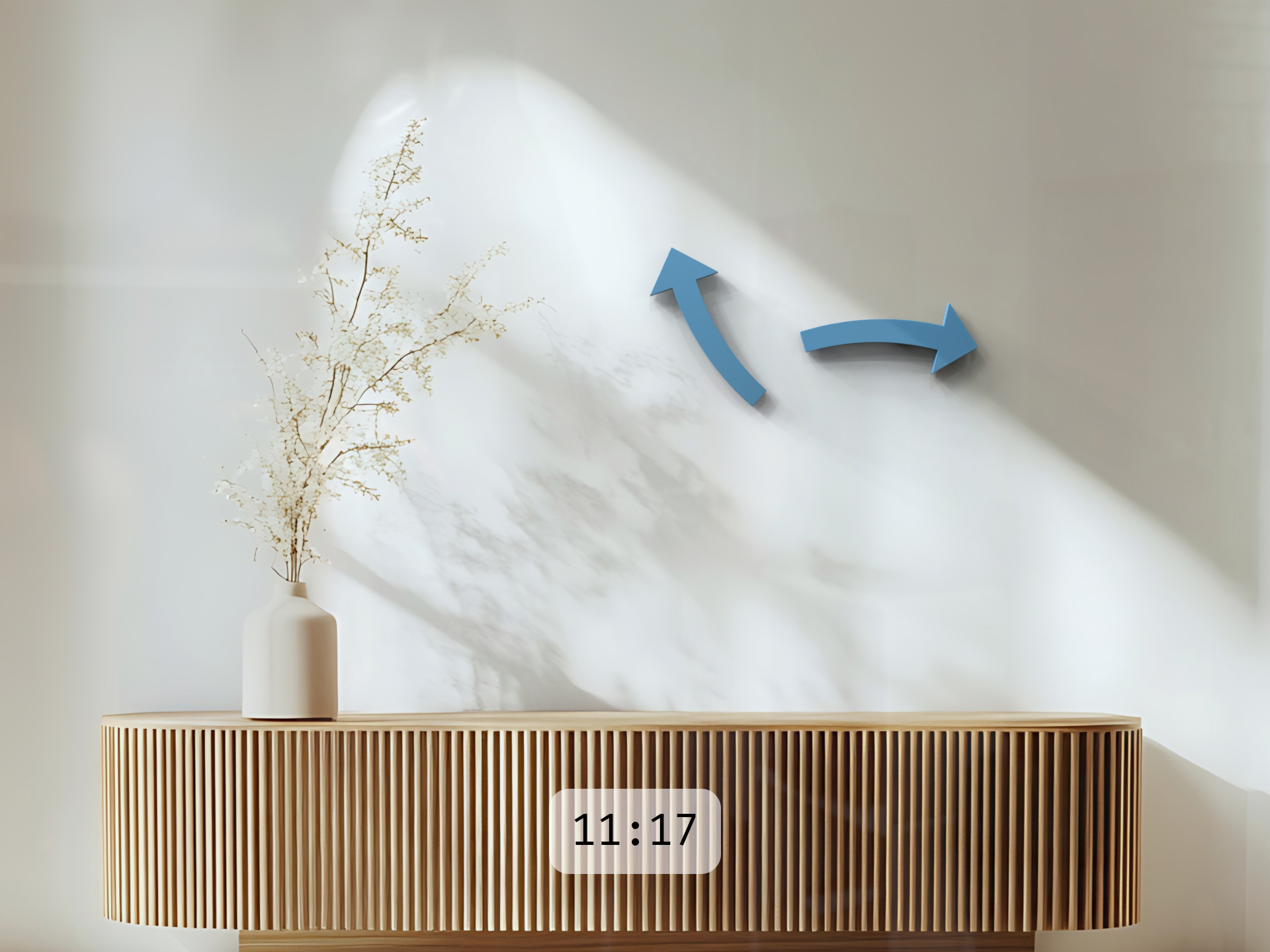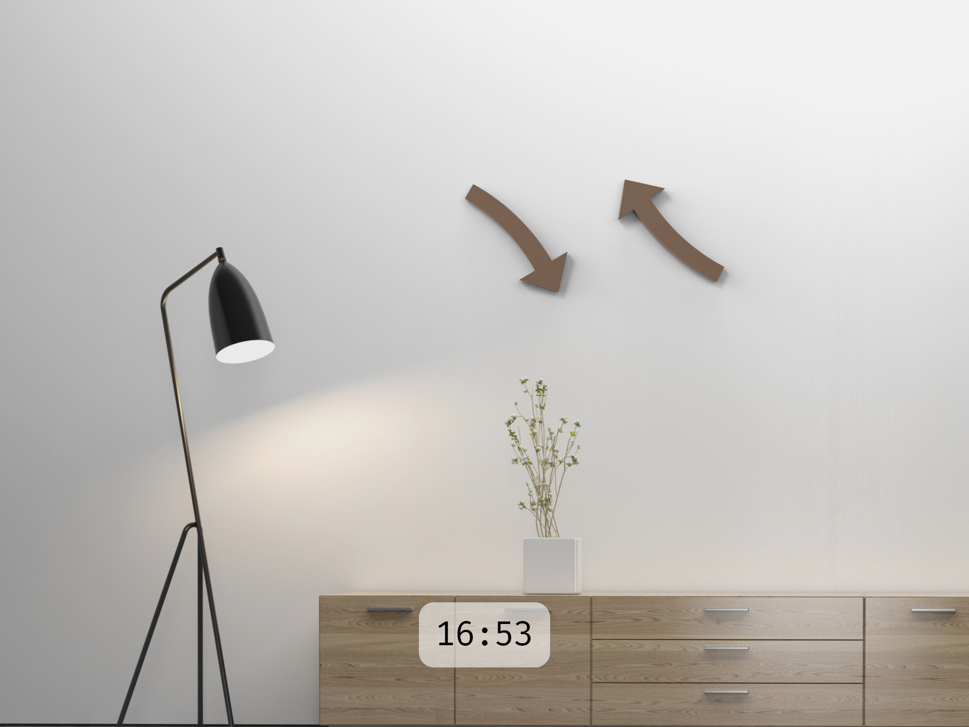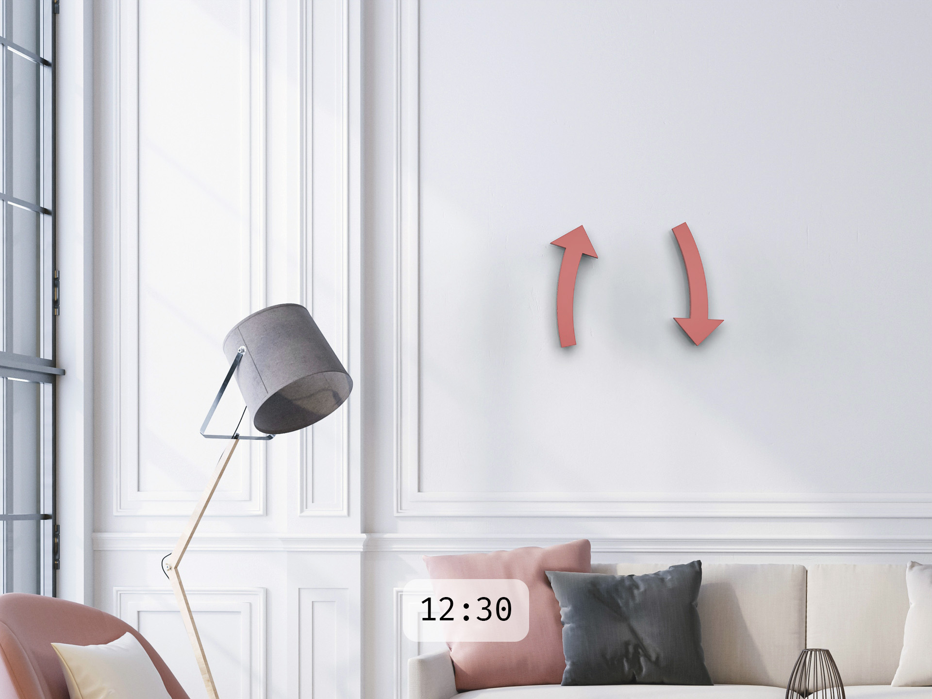 Die ganze cloc besteht nur aus zwei Pfeilen. Der linke zeigt die Stunden. Der rechte die Minuten. Setzt man die Pfeile in ihre Aufnahmen an der Wand, beginnen sie auf geheimnisvolle Weise, sich zu drehen. Wie schwerelos bewegen sich die Pfeile auf ihrer Bahn. Uhrwerke sind nirgends zu erkennen – sie sind in den Pfeilen selbst verborgen.