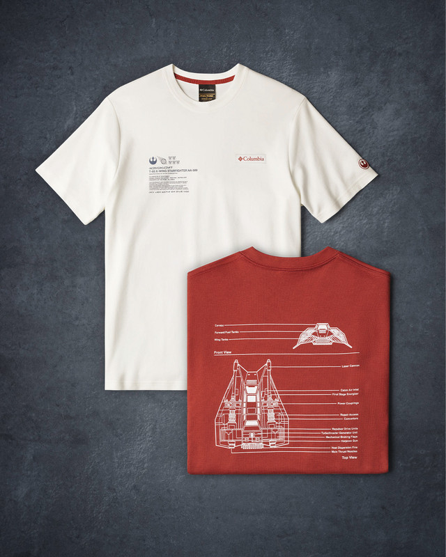 The short-sleeve shirt is a special edition heavyweight cotton blend with graphics of a T-65 X-Wing Starfighter or a T-47 Airspeeder/Snowspeeder, a badge inspired by Luke Skywalker’s helmet and messages in Aurebesh.