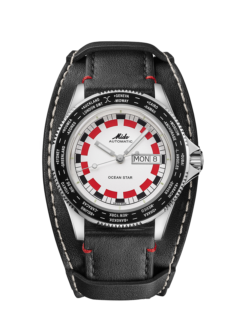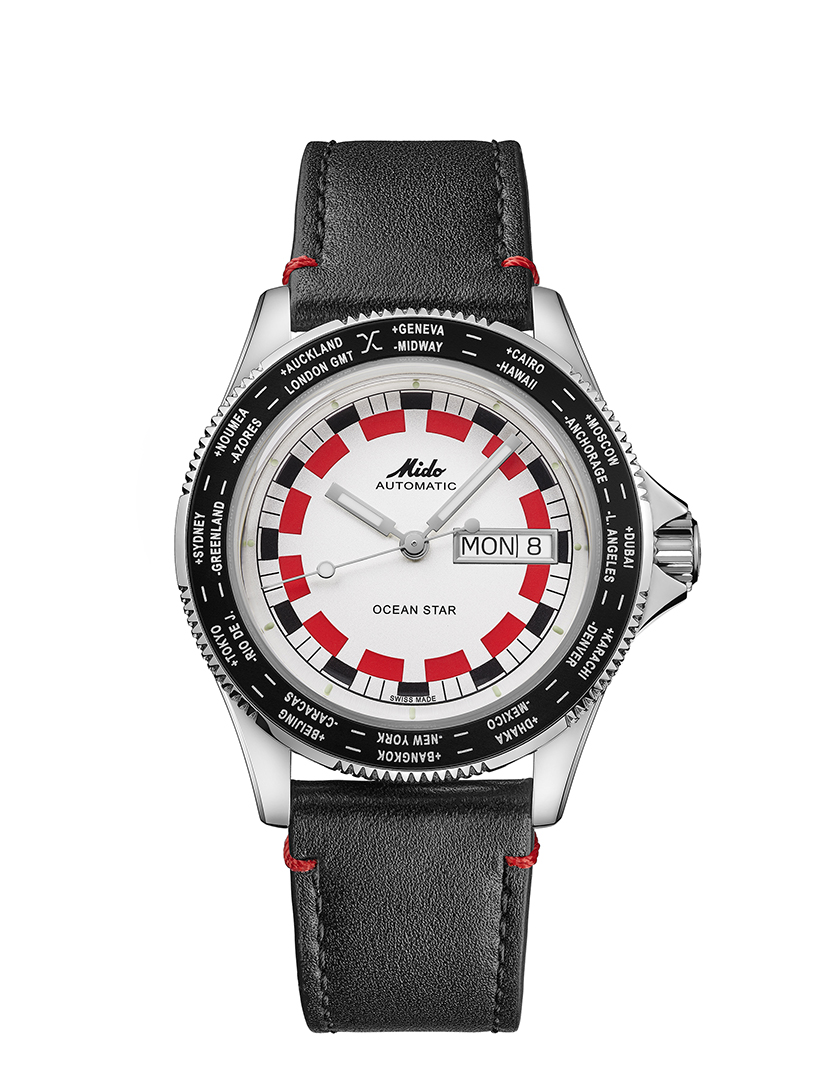 MIDO dresses the Ocean Star Worldtimer in a retro style, inviting you on grand journeys. Its strengths? A vintage charm inspired by a MIDO model from the 1970s—revealed by an emblematic dial with a black and red checkerboard pattern and the period MIDO logo—high-precision mechanics, and water resistance to 200 meters, the signature of the Ocean Star collection. Its unwaveringly reliable spirit of discovery is adorned with sublime historical details.