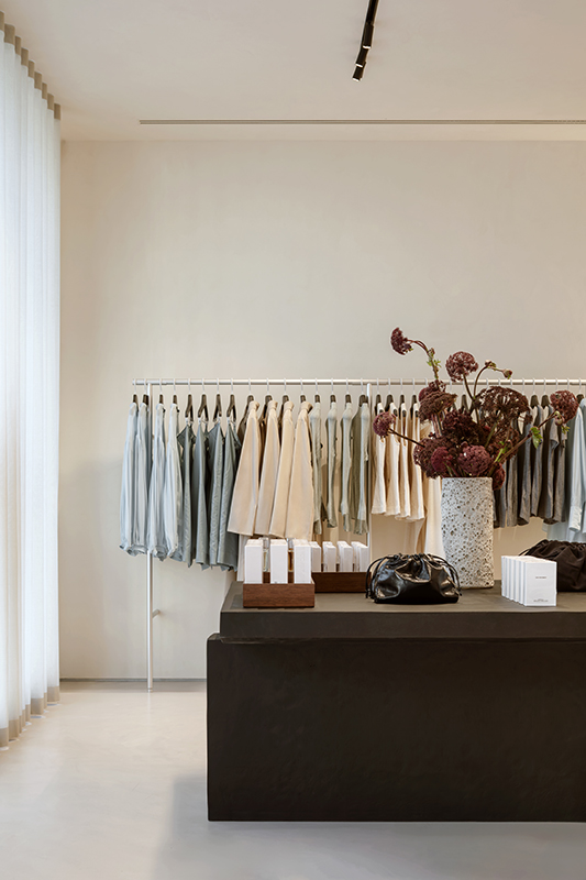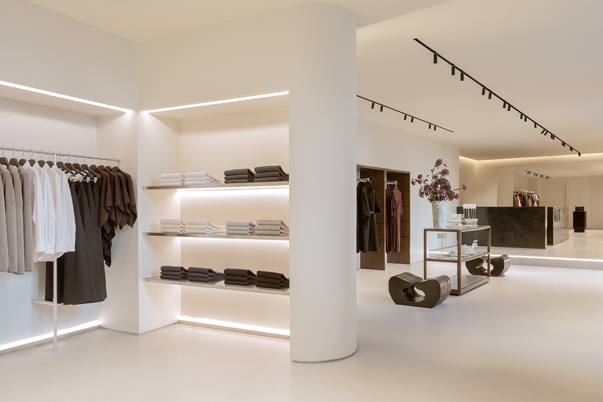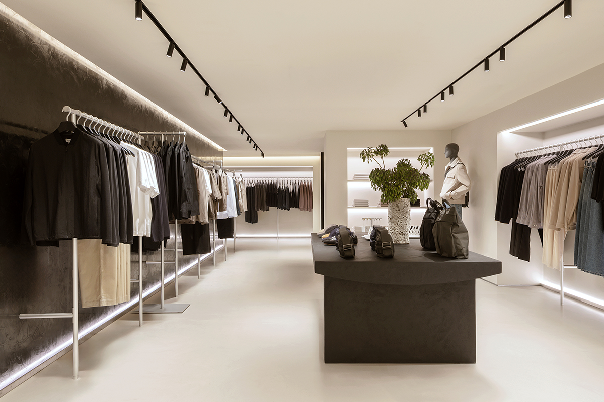 A soft white palette anchors the interior, providing a neutral backdrop for COS’ collections. Spanning