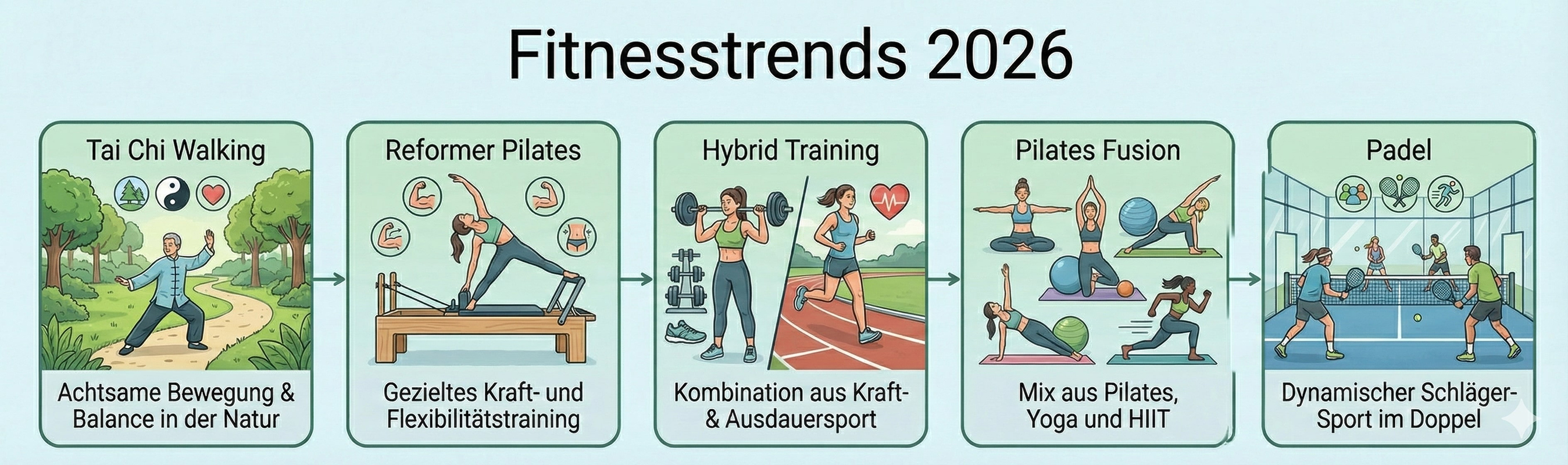 - Fitnesstrends setzen auf ganzheitliche Stärke: Trainingsformen wie Tai Chi Walking, Pilates und Hybrid Training kombinieren gezielt Kraft, Ausdauer, Stabilität und Körperbewusstsein und scheinen damit den Nerv der Zeit zu treffen.