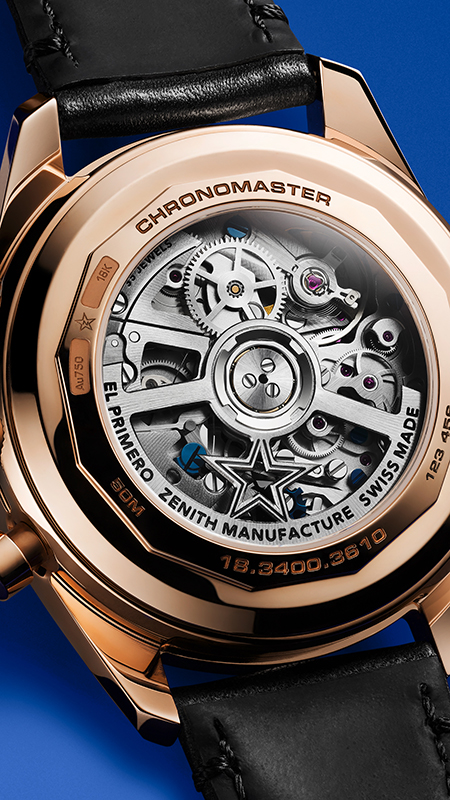 Angetrieben wird die CHRONOMASTER Original Triple Calendar von dem Automatikwerk El Primero 3610. Diese moderne Ausführung des legendären Chronographenwerks von ZENITH ermöglicht eine Messung auf die Zehntelsekunde genau. Um sich die Frequenz von 5 Hz vollends zunutze zu machen, vollführt der Chronographensekundenzeiger eine Zifferblattumdrehung in 10 anstatt der traditionellen 60 Sekunden. So zeigt die Funktion auf der ringförmigen, in 100 Einteilungen gegliederten Skala präzise die Zehntelsekunde an. Trotz des vollständigen Kalendermechanismus beträgt die Gangreserve der Uhr 60 Stunden. Die integrierte Architektur des Uhrwerks ist durch den Saphirglasboden des Gehäuses sichtbar und gibt den Blick auf ein blaues Säulenrad und die Schwungmasse mit dem fünfzackigen ZENITH Stern frei.