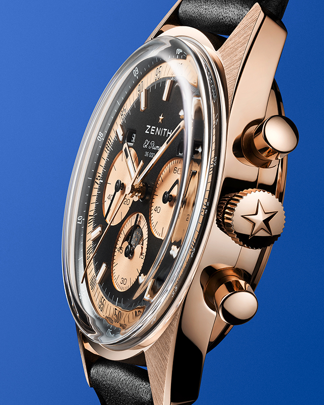 2024 wurde die praktische Kombination aus Kalender und Mondphase mit der CHRONOMASTER Original Triple Calendar wieder eingeführt. Sie erhielt ein neu gestaltetes, kompaktes Gehäuse von 38 mm, dessen harmonische Proportionen direkt vom bahnbrechenden A386 von 1969 mit erhabenem Saphirglases im Box-Stil, konischen Bandanstößen und Drückern im Pumpenstil inspiriert sind. Das extrem gut und intuitiv ablesbare, perfekt ausbalancierte Zifferblatt lässt die Kalenderanzeigen nahtlos mit den drei Chronographenzählern des El Primero verschmelzen. Diese werden durch Öffnungen angezeigt: Die Wochentags- und Monatsanzeigen sind symmetrisch über den Chronographenzählern bei 11 Uhr und 2 Uhr positioniert, das Datum erscheint in seiner traditionellen Position bei 4:30 Uhr. Die Mondphase schließlich wurde in den 60-MinutenTotalisator bei 6 Uhr integriert.