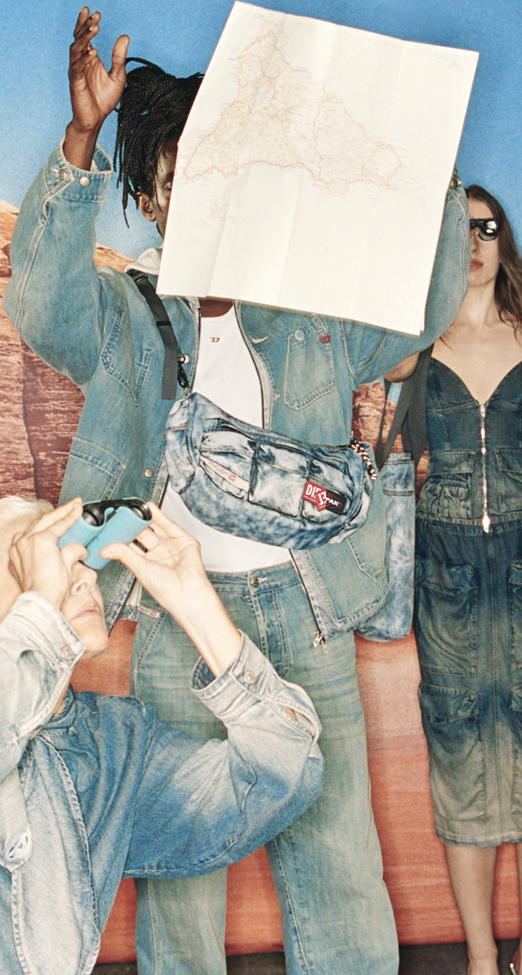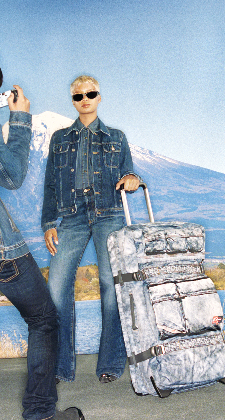 From irreverent details to playful illusions, Diesel’s imprint is felt throughout the collection. A deconstructed logo peels back to reveal Eastpak’s original mark, while the collaboration plays with contrast through two distinct executions: a trompe l’oeil denim print, and a bi-material mash-up. The trompe l’oeil pieces showcase Diesel signatures like multi-pocket construction, abraded textures, and coin-pocket branding, cleverly printed for a hyperreal finish. The Day Pak’r, Shoulder Bag, Shop’r Tote, and Springer take on a hyperreal twist, while the Transit’r luggage (in S and L sizes) becomes a catwalk-ready statement piece with cleverly placed pockets, real and imagined.