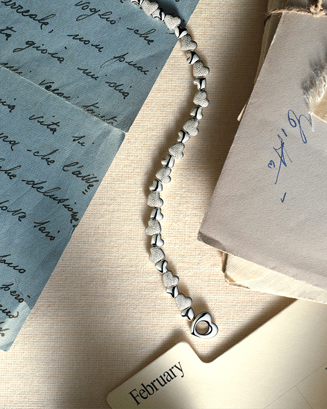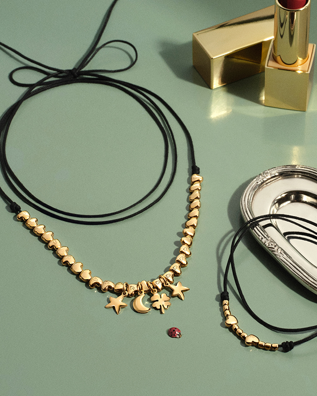 This expression continues in the Seal Charms, which now offer the option of having symbolic motifs engraved. Alongside this evolution, Mini Granelli celebrates its comeback in 9K yellow gold and 9K rose gold, adding a delicate connector to the collection. The pieces are complemented by special velvet cords in burgundy, blue, and green, lending warmth and a unique tactile quality to the Valentine’s Day story.