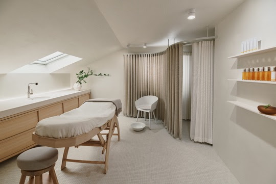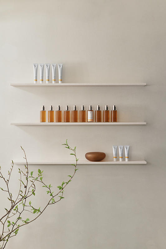 Die Gestaltung des Kosmetiksalons ist eine Hommage an die Handwerkskunst. Sie zeigt sich in den maßgeschneiderten Regalen ebenso wie bei der von Hand und komplett aus Holz angefertigten Liege. Bei der Raumausstattung wurden bewusst natürliche Materialien und Stoffe gewählt: Stein, Holz, Lehm und Leinen korrespondieren mit den Texturen der Kosmetik und schaffen eine ruhige Atmosphäre, die das Pflegeerlebnis unterstützt.