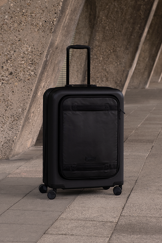 The CNNCT Case features innovative details such as a TSA lock and a practical telescopic handle. Two separate main compartments and a zippered pocket on the front allow for easy organization. The case is available in three different sizes (S, M, L) and color variations.