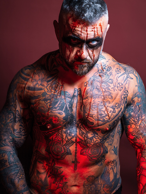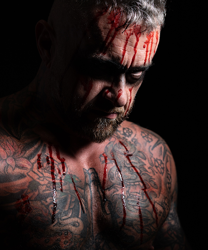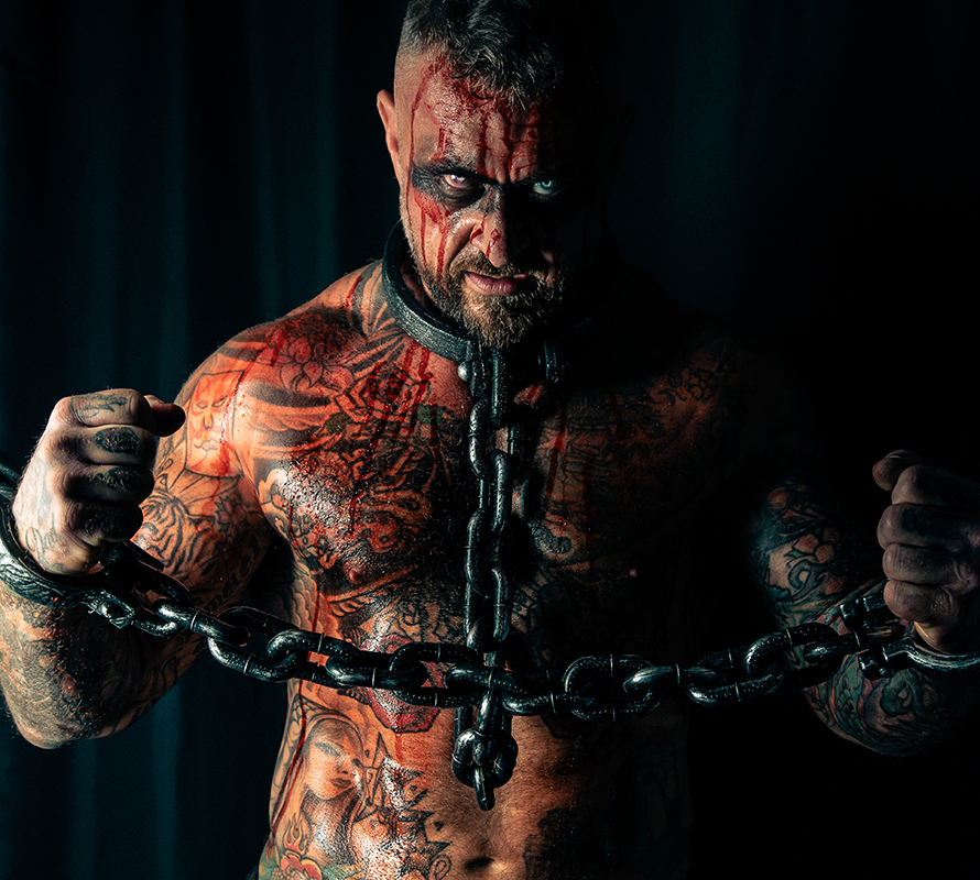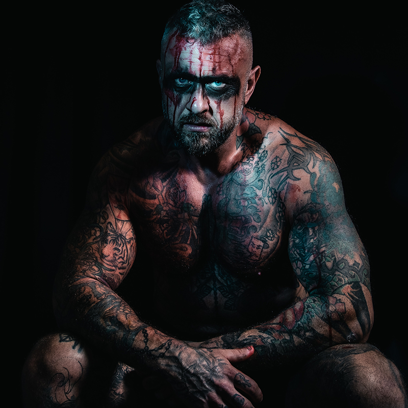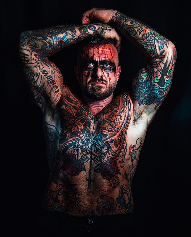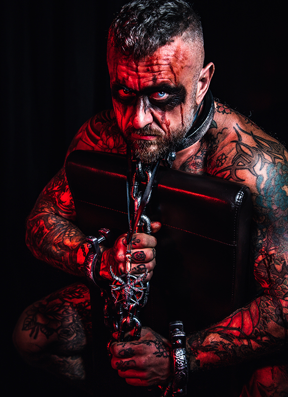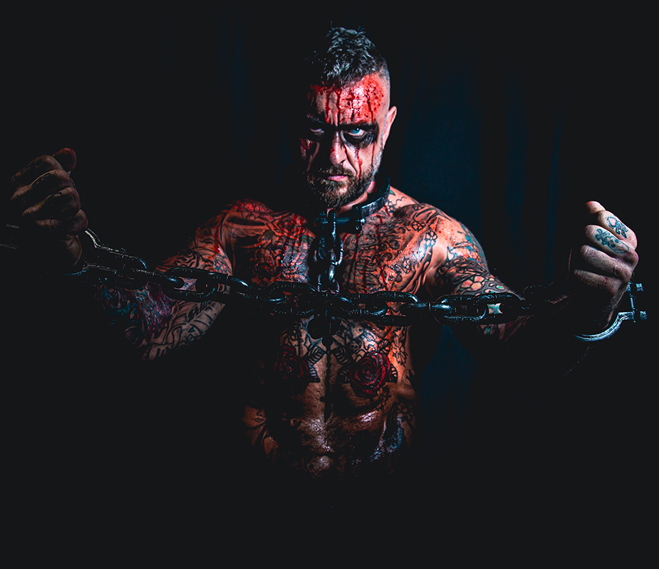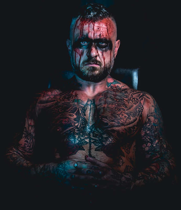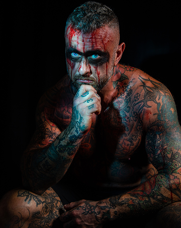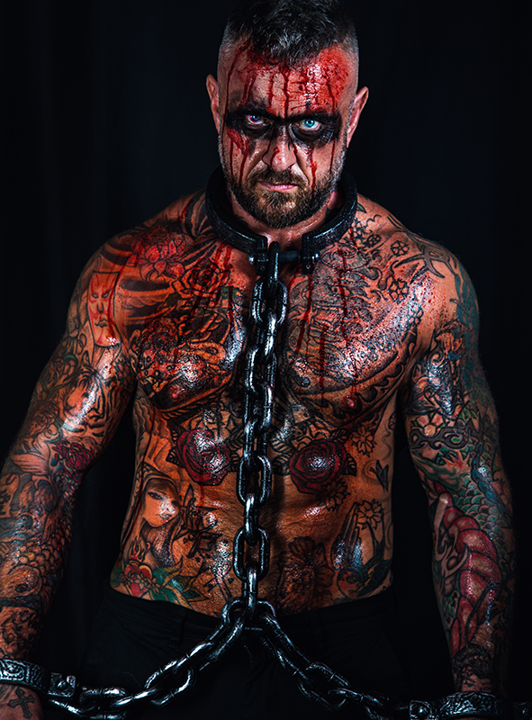 This is my 2nd shoot with Tyson. He is an amazing Professional Wrestler, dog lover, gym nasty. Decided to try modelling and is a total natural. We planned the shoot together, trying a horror gothic theme with added blood and chains. It took place I my home studio.
