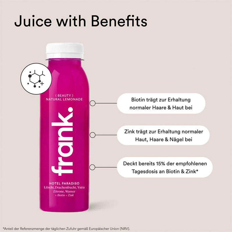 Die sommerlichen Limonaden von The Frank Juice bieten drei außergewöhnlich leckere, kaltgepresste Sorten, ganz ohne raffinierten Zucker und mit echten Mehrwerten für Körper & Lifestyle.