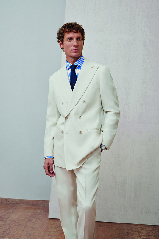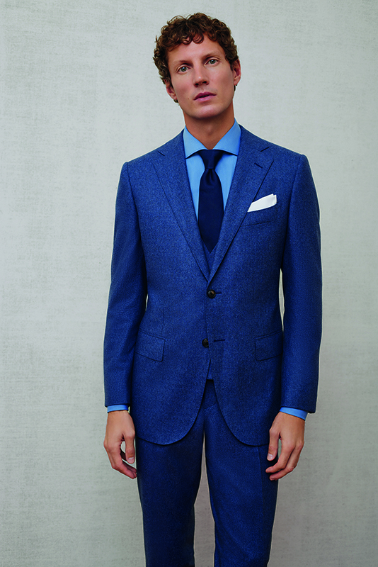 A premium statement of the current collection: the new preppy look. Striking twill stripes on high-quality two-ply in royal blue, accompanied by a wide club tie with woven motif. The light combination gives an elegant, fresh, and classic look.