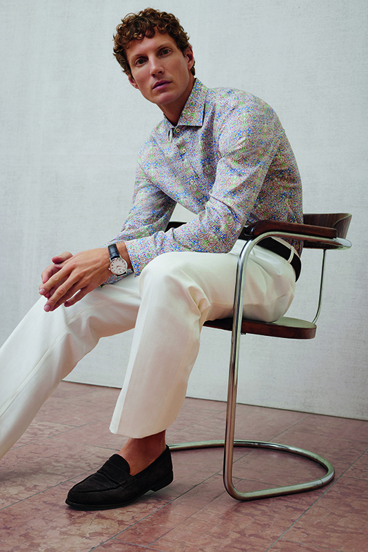 The retro romance is reflected in expressive floral prints that are printed masculinely on denim or corduroy. This creates exciting effects and textures.