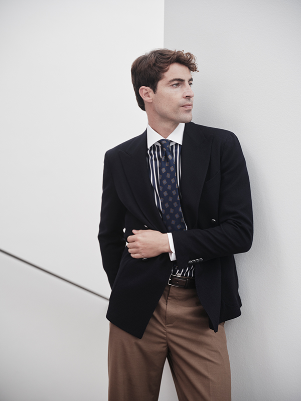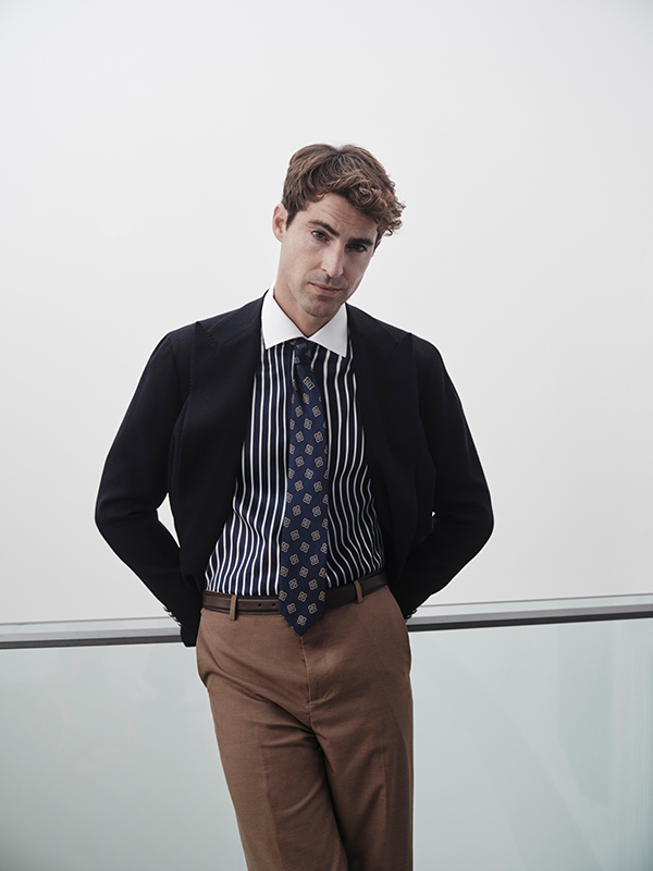 Old money styles remain an integral part of the style. In this context, stripes continue to gain importance. Here, things can get a little more expressive. As a key piece, we’re showing a multicolored satin stripe on a two-ply yarn with a contrasting white cuff and collar.