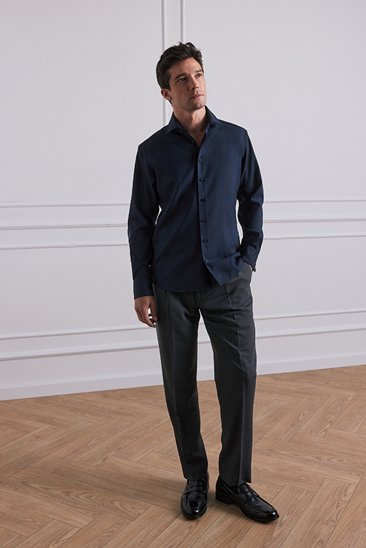 The material from which the shirt is made is described as a two-ply fabric – a fabric consisting of two individual threads twisted together. Twisting makes the thread thicker, stronger, and more durable, and more resistant to pilling. This improves the fabric quality, gives it a more refined feel, and ensures a comfortable fit. The non-iron shirt, available online and in stores from mid-October, also features breathability and temperature regulation.