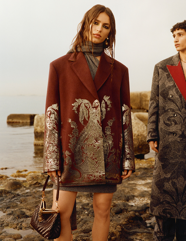 Etro’s timeless elegance writes the pages of a modern myth where beauty embraces art and the classic is constantly reinvented in the present. In this magical and enchanting mise-en- scene, the search for the elsewhere is reflected in an aesthetic vision rich in colors and contrasts, with fluid lines, enveloping knits, and dense and protective fabrics enriched with shiny foils, jacquard patterns, and Paisley designs.