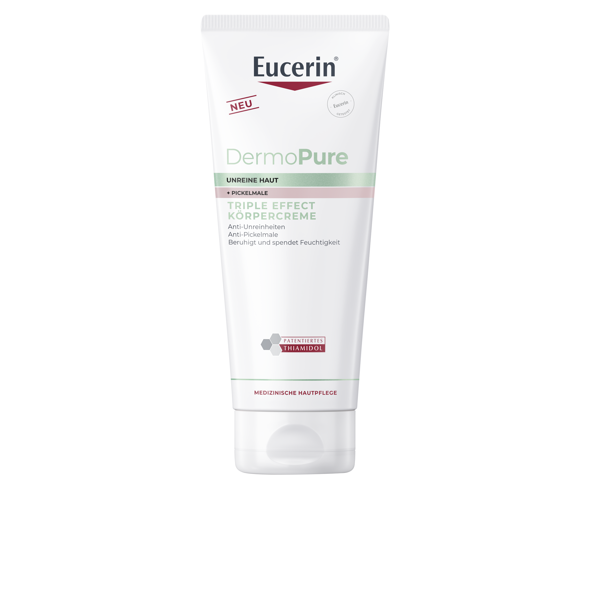 Deshalb erweitert Eucerin DermoPure sein Sortiment und bietet ab Juni die neue Triple Effect Körpercreme an. Sie wurde konkret zur Behandlung von Körperakne entwickelt und ist somit auf die speziellen Hautbedürfnisse am Körper abgestimmt.