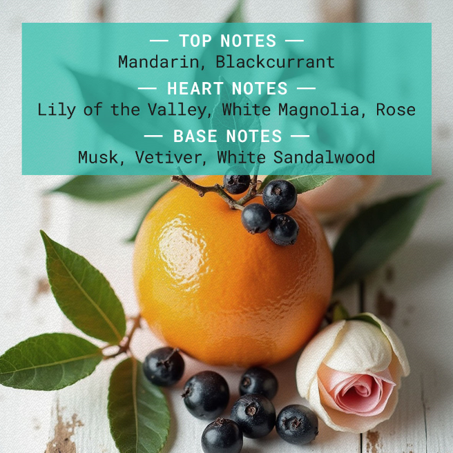 Den Auftakt macht eine belebende Kopfnote: Mandarine bringt eine helle, saftige Frische mit sich, Schwarze Johannisbeere fügt eine leicht herbe Tiefe hinzu.