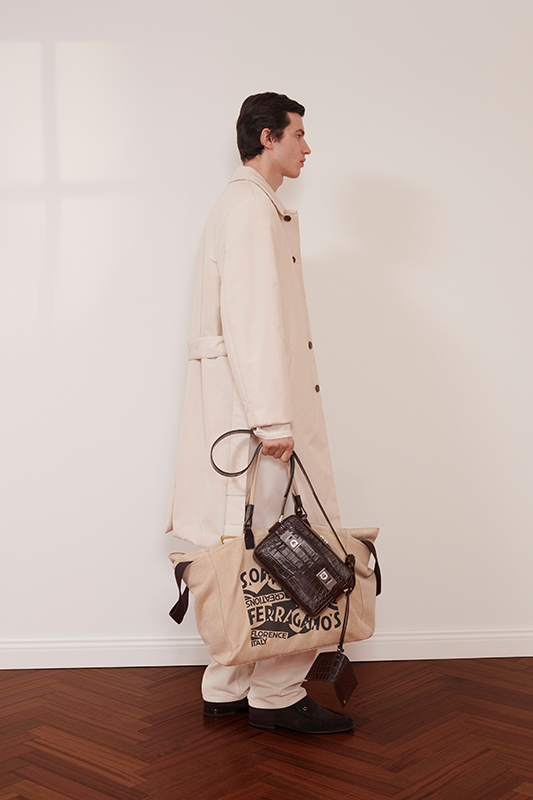 A distinctive feature of the collection is the subtle blend of artisanal tradition and contemporary design. Historical details like the signature Gancini clasp are reinterpreted and appear as subtle accents on bags and garments. The combination of different textures, such as the interplay of soft cashmere with textured leather, also underscores the sophisticated balance between old and new. This interplay makes the collection a homage to the longevity and versatility of classic wardrobe pieces.