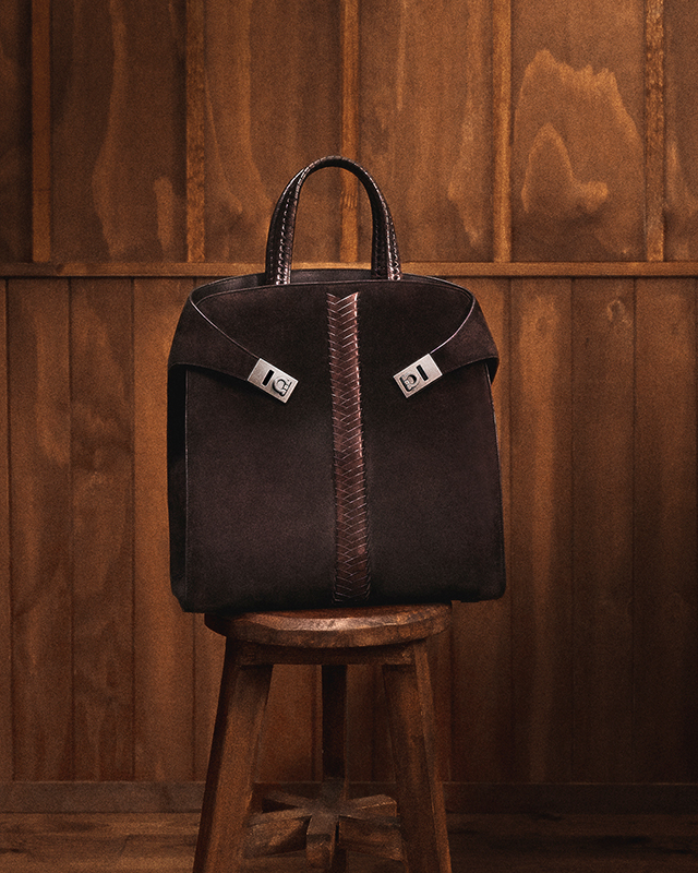 Ferragamo offers the perfect attire for these occasions. Elegant dresses and modernly tailored suits add stylish touches. The look is complemented by select accessories such as the Hug Bag in a mini or clutch version.