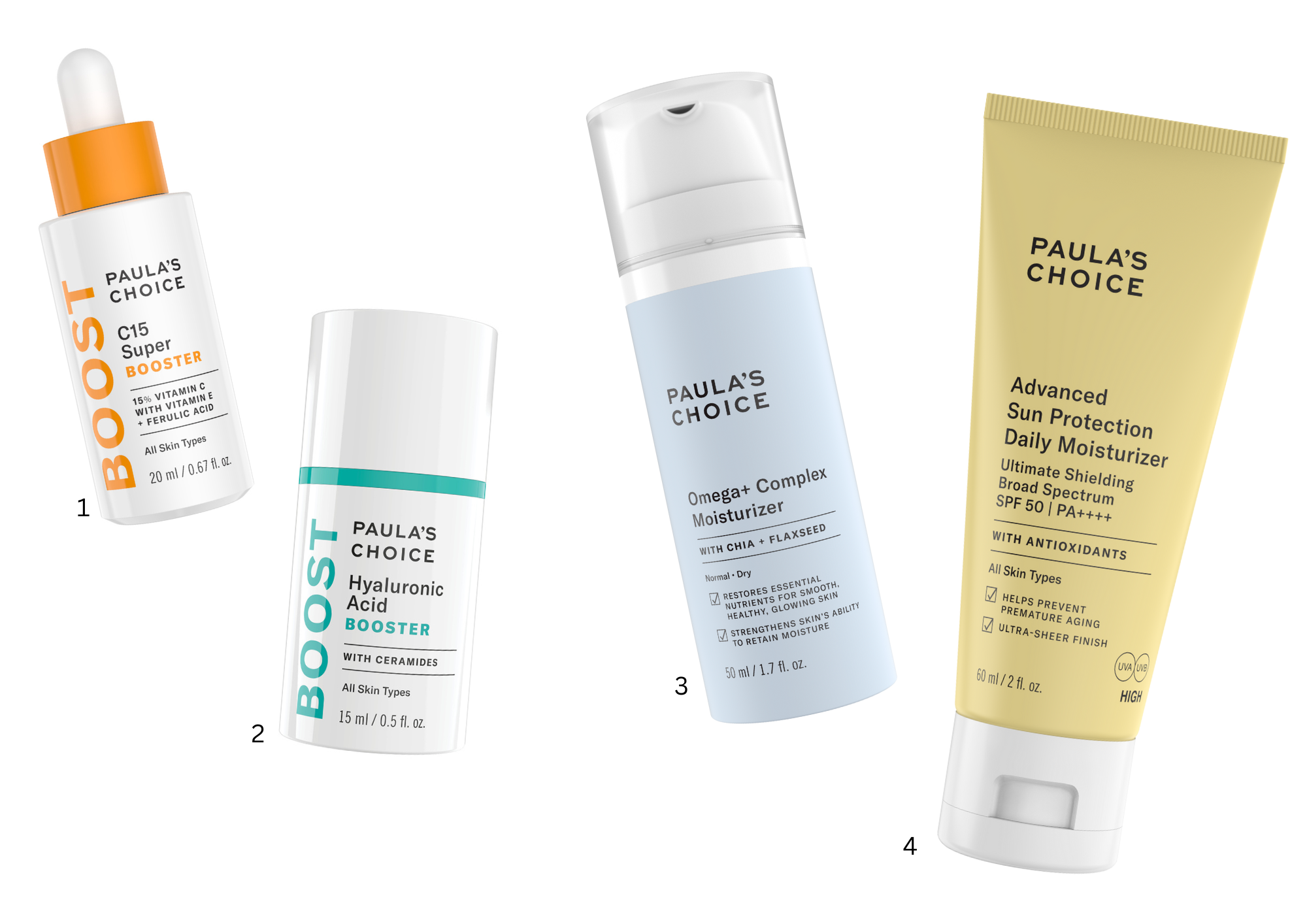 1 C15 Super Booster, 20 ml, 59€ 2 Hyaluronic Acid Booster, 15ml, 46€ 3 Omega+ Complex Moisturizer, 50 ml, 44€ 4 Advanced Sun Protection Daily Moisturizer, 60ml, 45€