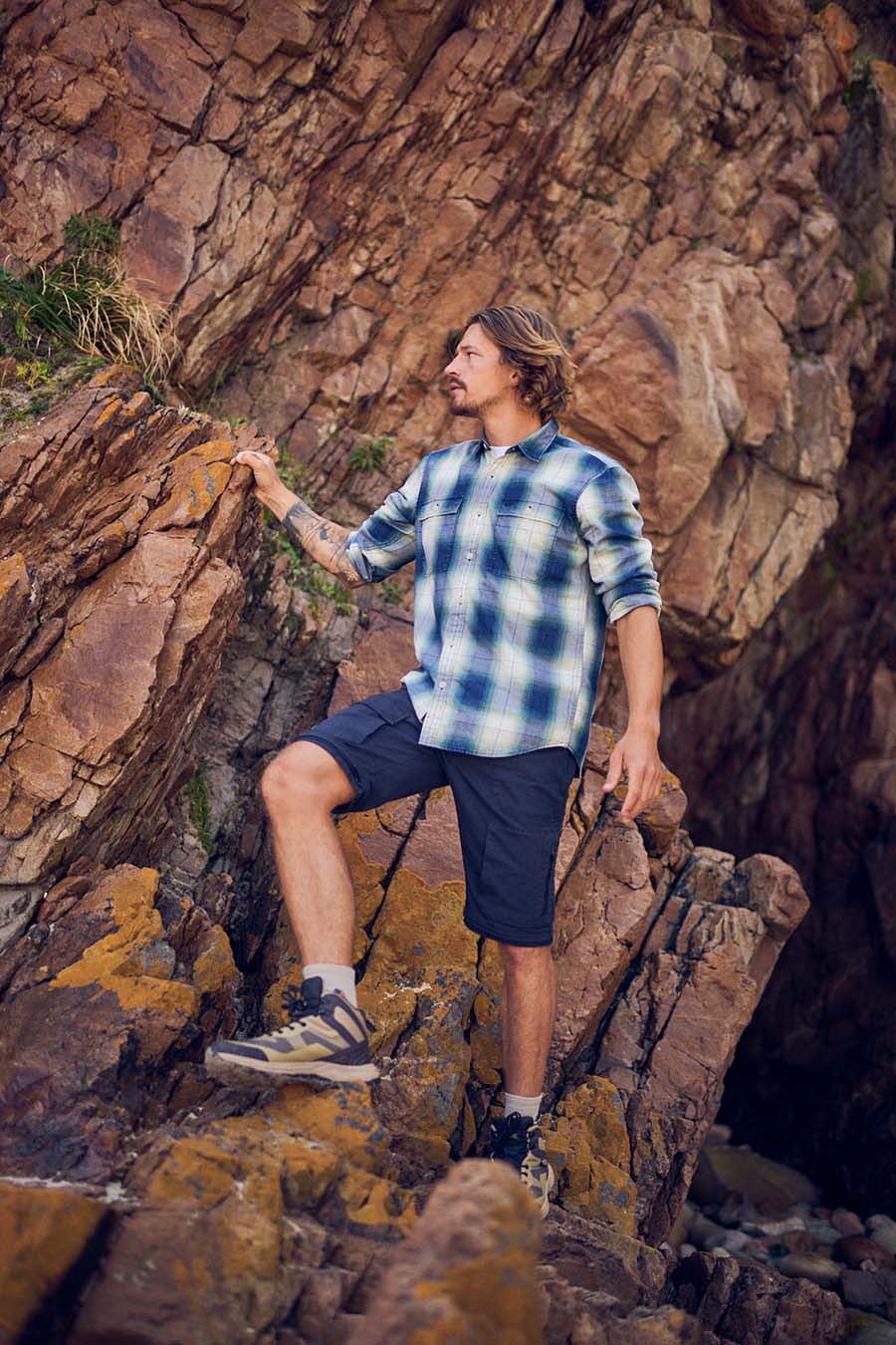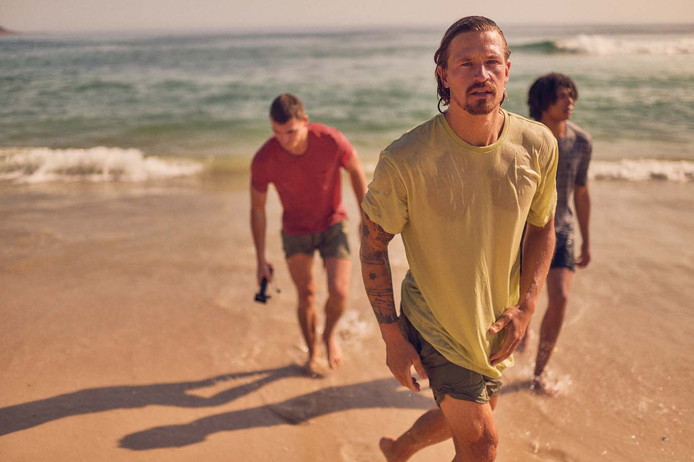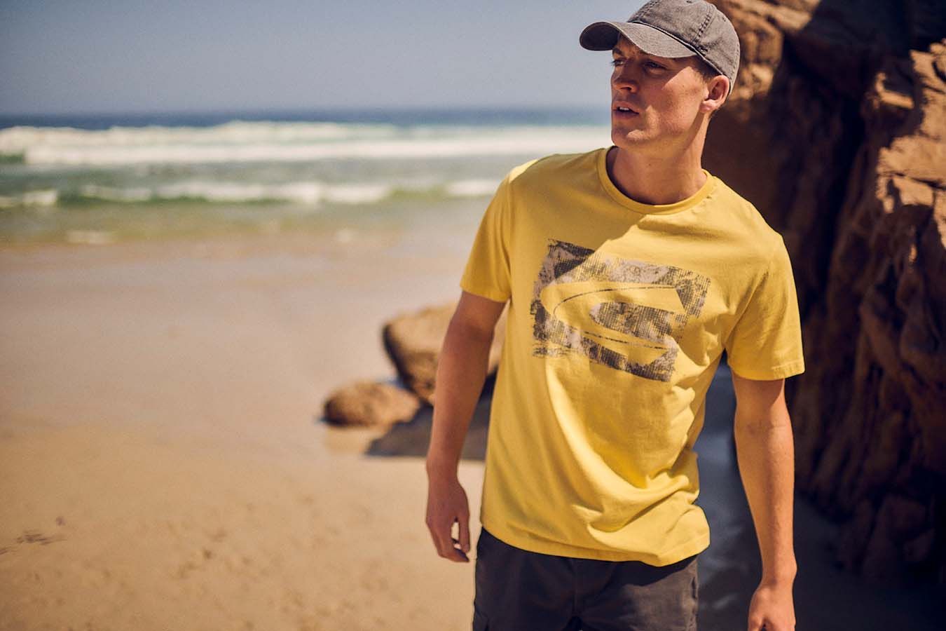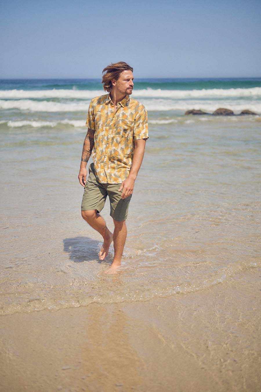The camel active menswear ranges from the basic short-sleeved shirt in pistachio to the resort shirt with an art print in shades of blue to the short-sleeved shirt in a polo look in piqué with a graphic palm print in beige/khaki. The beach shorts with drawstring have a quick-dry function and mesh insert pockets. The ideal companion for jumping straight from your bike into the nearest lake, true to the camel active motto „Made For Daily Adventures“.