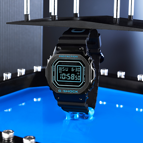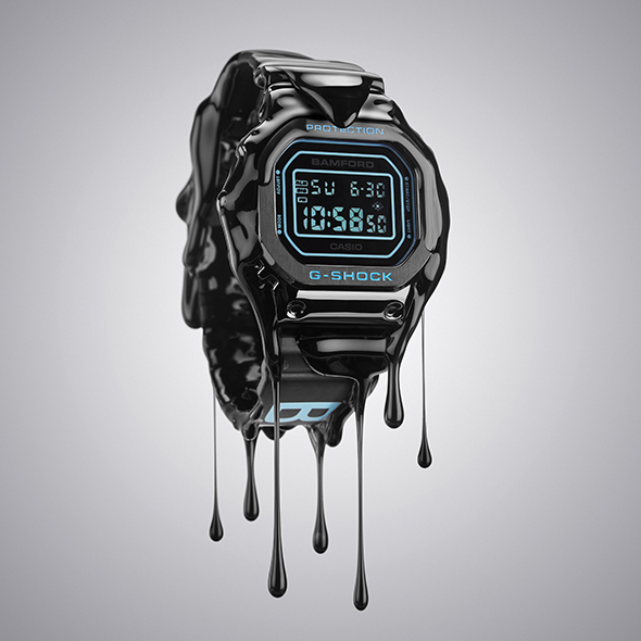 For the third collaboration between Bamford and G-SHOCK, the iconic G-SHOCK GM-5600 model was chosen and combined with George Bamford’s masterful design. The deep black stainless steel and resin case of the GM-5600BWD is finished with an IP coating, providing the perfect contrast to Bamford’s signature aqua-blue accents. The black and blue design extends from the case and the striking Bamford logo on the bio-resin strap to the exclusive packaging in which the watch is delivered.