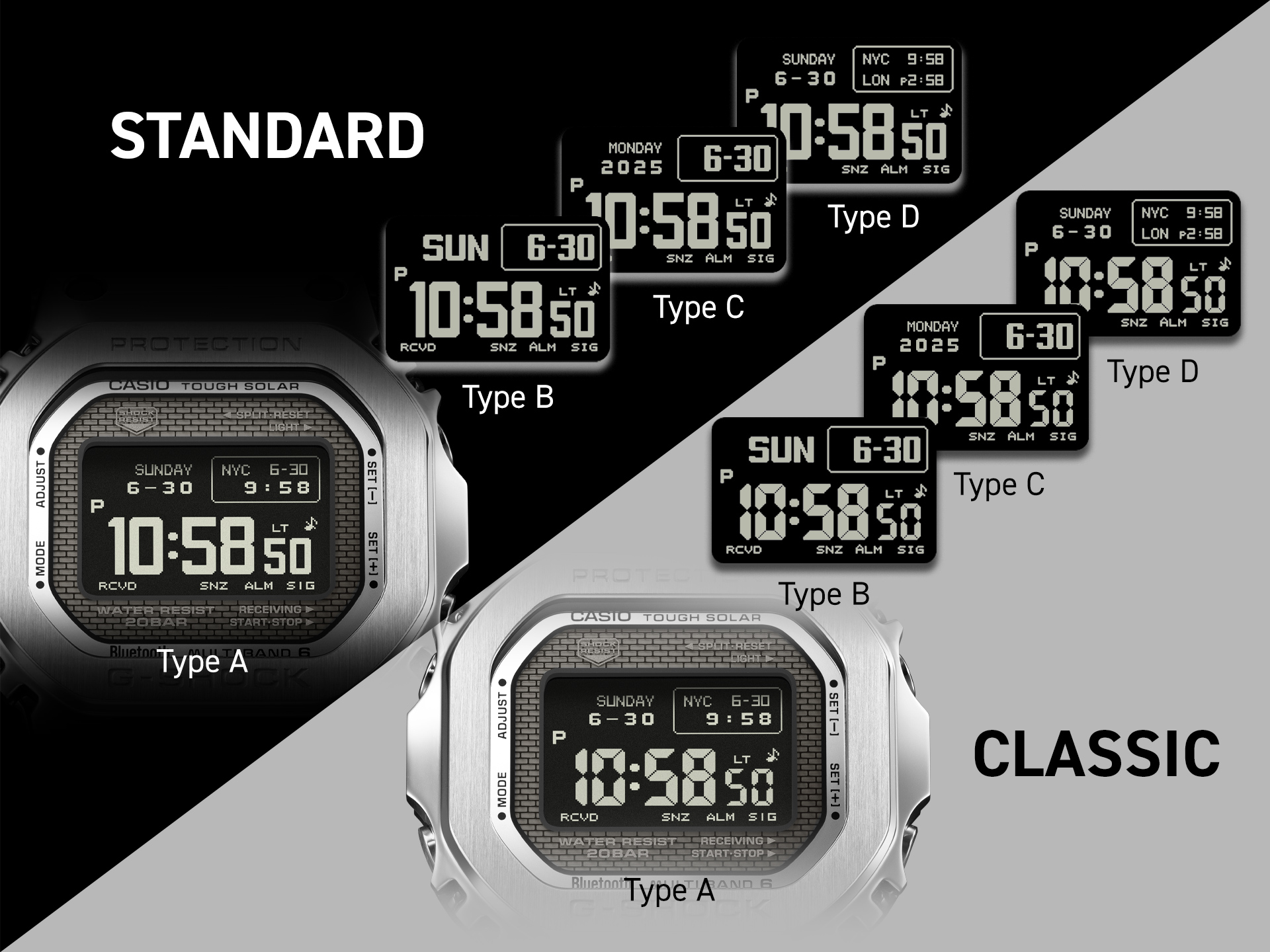 The new GMW-BZ5000 is the first all-metal G-SHOCK watch with a MIP display for optimal readability, even in direct sunlight or at an angle. The high-resolution MIP display allows for flexible arrangement of numbers and symbols, offering greater design freedom. Users can choose between four different layouts, displaying the date, day of the week, and time in two different cities. When connected to a smartphone, the app offers two different fonts for the time display: STANDARD or CLASSIC with the classic 7-segment display that has been available since the first G-SHOCK.