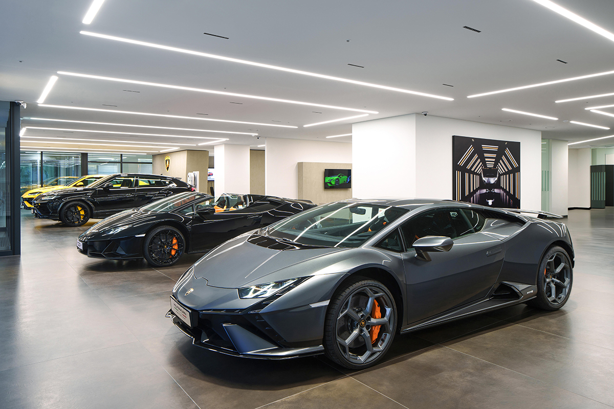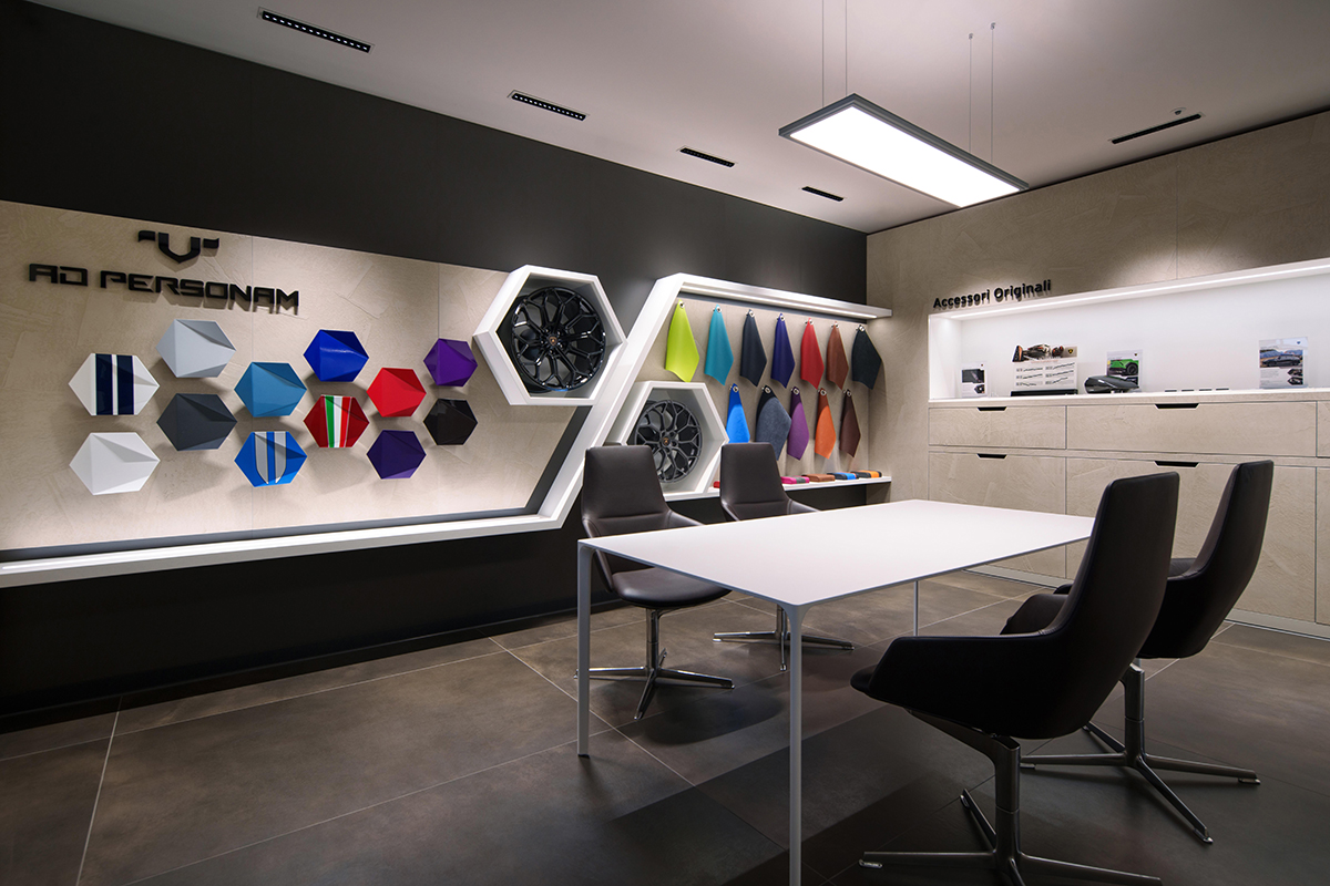 The showroom features the best of Italian automotive design and engineering, with the latest super sports cars and Super SUVs in the market, complete with Collezione and Accessori Originali fashion offerings and a dedicated Ad Personam room where customers can have the opportunity to personalize their dream cars from the exterior, interior to the colors and trims of their vehicles, reflecting their personalities and lifestyles with a nearly infinite of bespoke colours and materials using the Lamborghini Car Configurator. It also allows customers to immerse themselves in the process from touch to smell of the upholstery materials and exclusive materials such as carbon fiber.