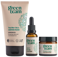 Mit drei Produkten – dem green team Reinigungsgel, dem green team Intensivserum und der green team Feuchtigkeitspflege nutzt die Serie gezielt ausgewählte natürliche Wirkstoffe. Sie verbindet umweltbewusste Pflege mit belegter Nachhaltigkeit für gesunde Haut und ein nachhaltiges Pflegeerlebnis.