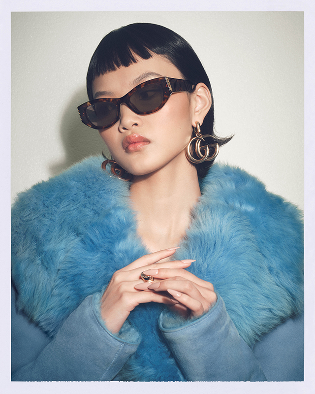 Other designs draw on iconic House codes: Rimless cat-eye sunglasses with gold-tone metal and bamboo temples and crystal details combine decorative elements with precise lines. Aviator silhouettes in gold-tone metal with the signature bamboo top bar reference the House’s heritage design vocabulary. A variety of acetate frames for optical lenses complement the collection, offering versatile shapes that range from contemporary clarity to retro references.