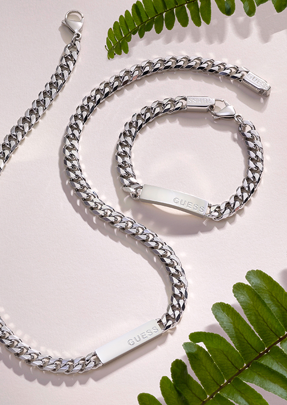Für die Saison SS23 kehrt die Herrenschmuckkollektion erweitert und topaktuell mit neu aufgenommenen oder neu gestalteten Elementen zurück, darunter das kultige 4G und der Löwe, seit jeher Symbole für GUESS.