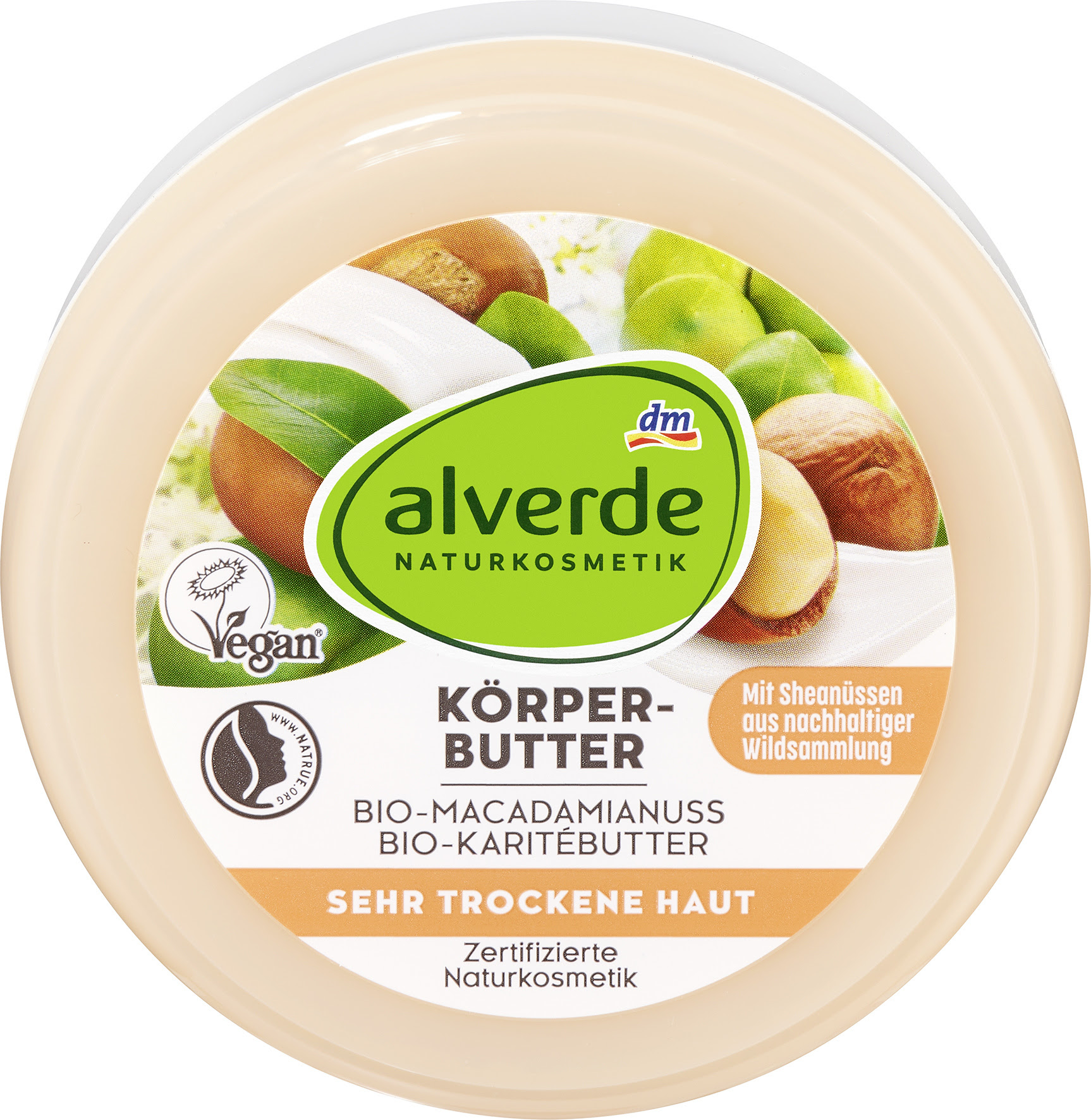 Die alverde NATURKOSMETIK Körperbutter Macadamianuss basiert auf einer veganen Rezeptur mit ausgewählten Inhaltsstoffen. Diese versorgt die Haut nachhaltig mit Feuchtigkeit und verleiht ein seidigglattes Gefühl sowie einen angenehmen Duft – den ganzen Tag. Zertifizierte Naturkosmetik. Rezeptur ohne Mikroplastik und wasserlösliche rein synthetische Polymere.