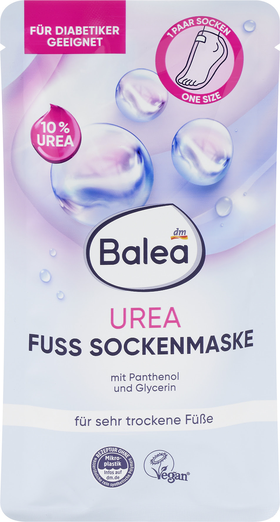 Die Urea Fußsockenmaske von Balea eignet sich hervorragend als Pflege für strapazierte Haut an den Füßen. Die Maske enthält Panthenol, Avocadoöl und einen feuchtigkeitsspendenden Wirkstoffkomplex, der der Haut intensive Pflege bietet. Die Maske pflegt intensiv und hinterlässt geschmeidig weiche Haut. Rezeptur ohne Mikroplastik und wasserlösliche rein synthetische Polymere.
