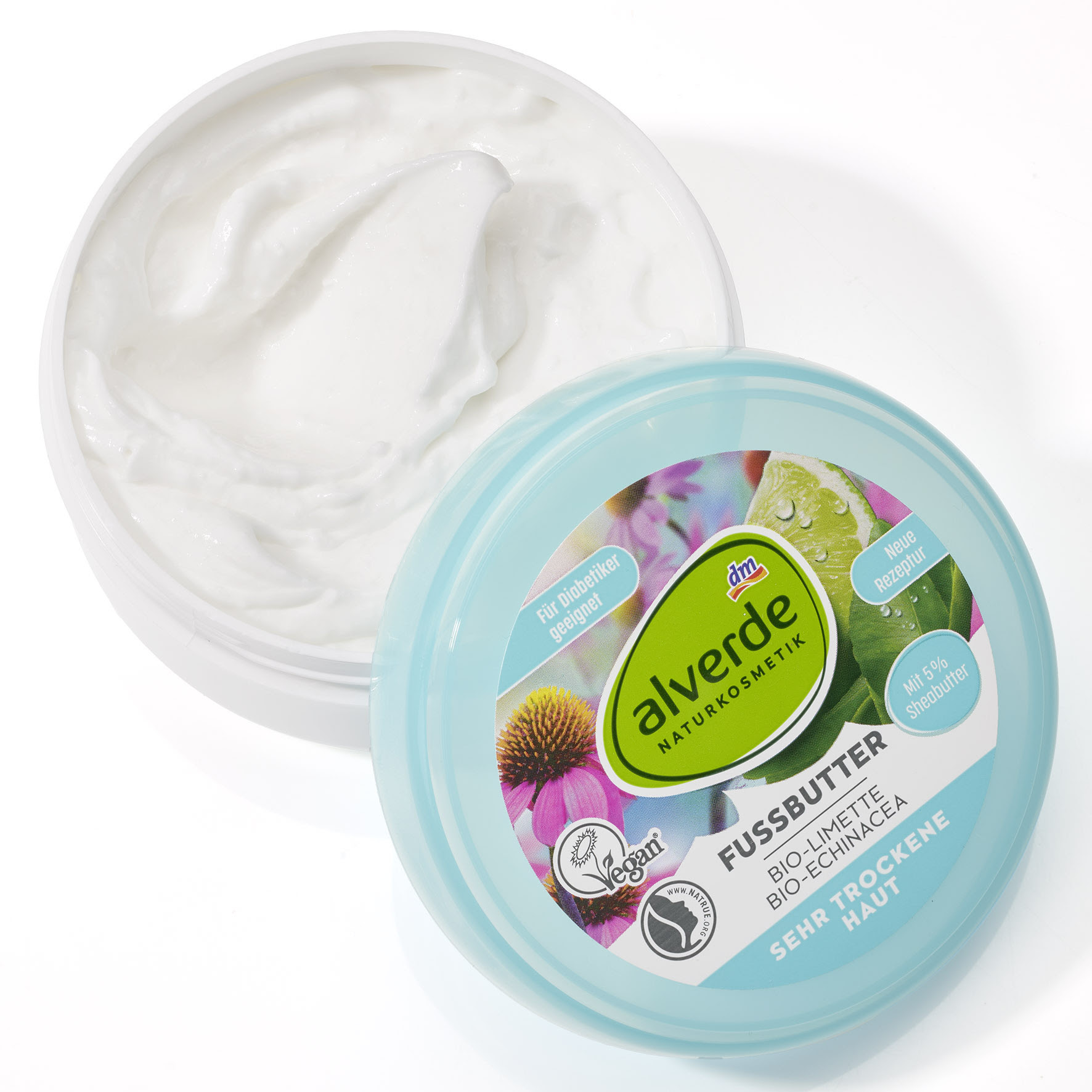 Die reichhaltige sowie vegane Pflegekombination der Fußbutter von alverde NATURKOSMETIK spendet intensive Feuchtigkeit und bewahrt diese mit pflegender Bio-Sheabutter sowie rückfettender Shoreabutter. Die Formulierung mit Bio-Limetten- und Bio- Echinacea-Extrakt verwöhnt beanspruchte Füße und wirkt mit ihrem Duft desodorierend. Unangenehme Trockenheits- und Spannungsgefühle werden mit der Unterstützung von Bio-Traubenkernöl reduziert – für ein regeneriertes Hautgefühl. Rezeptur ohne Mikroplastik und wasserlösliche rein synthetische Polymere.